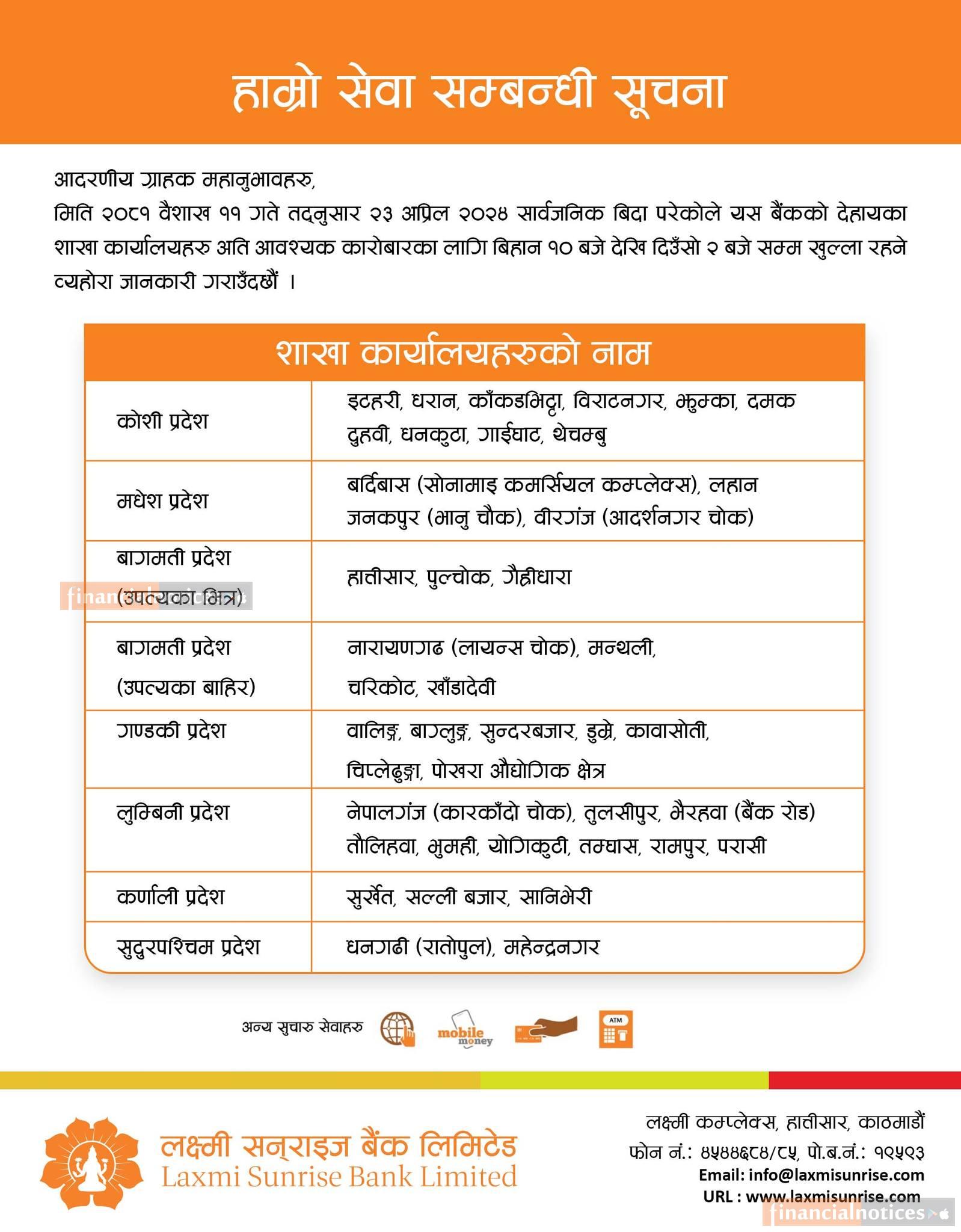 बिदाको दिन शाखा सञ्चालन सम्बन्धमा लक्ष्मी सनराइज बैंकको जरुरी सूचना -