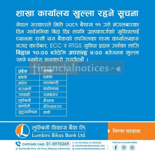 लुम्बिनी विकास बैंकको शाखा कार्यालय खुल्ला रहने सूचना -