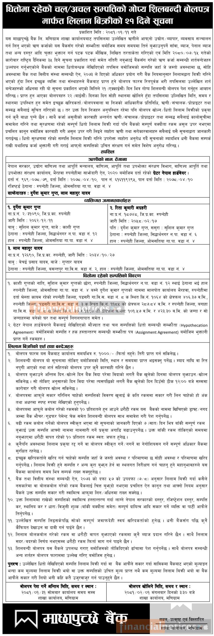 धितोमा रहेको चल अचल सम्पत्तिको गोप्य शिलबन्दी बोलपत्र मार्फत लिलाम बिक्रीको सूचना