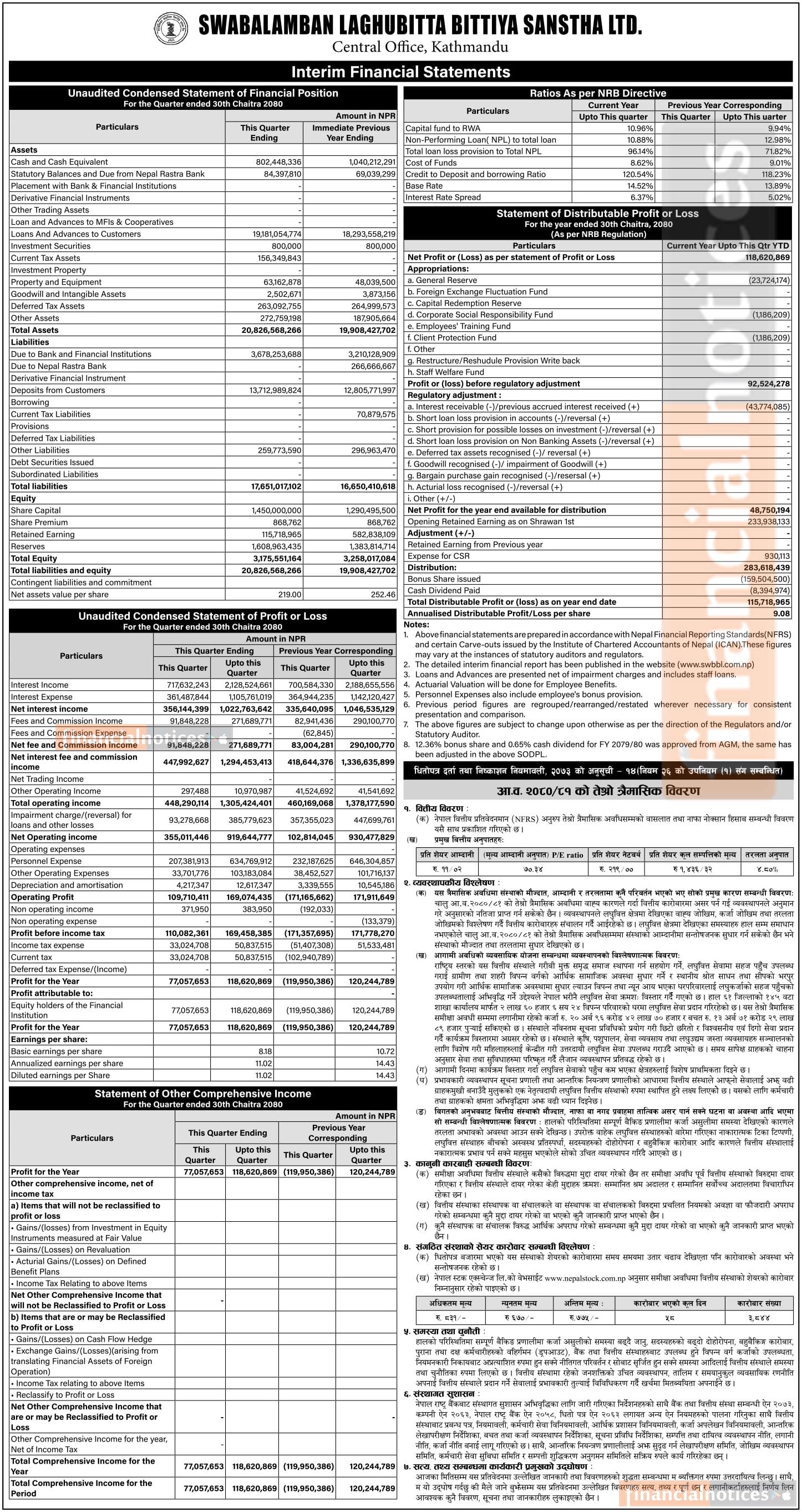 स्वावलम्बन लघुवित्तको खुद नाफा ११ करोड ८६ लाख २० हजार रुपैयाँ