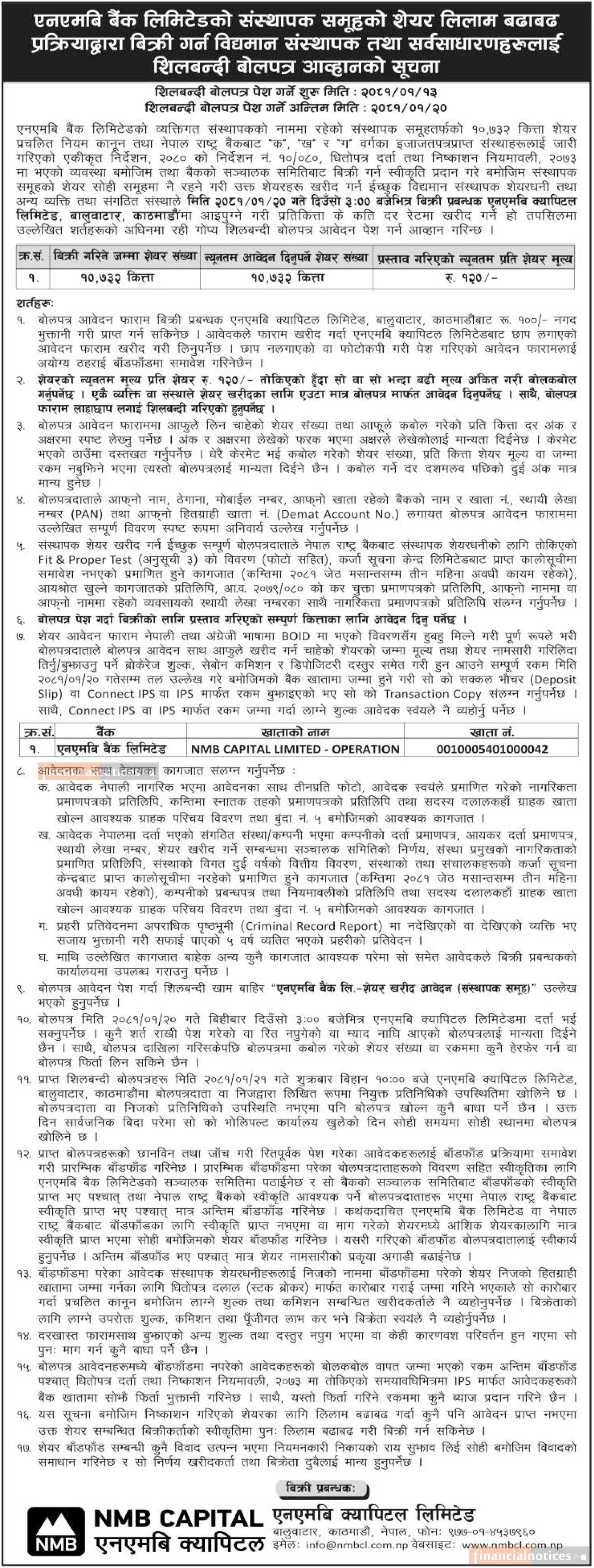 एनएमबि बैंकको १०७३२ कित्ता संस्थापक सेयर लिलामी खुल्ला सम्बन्धी सूचना