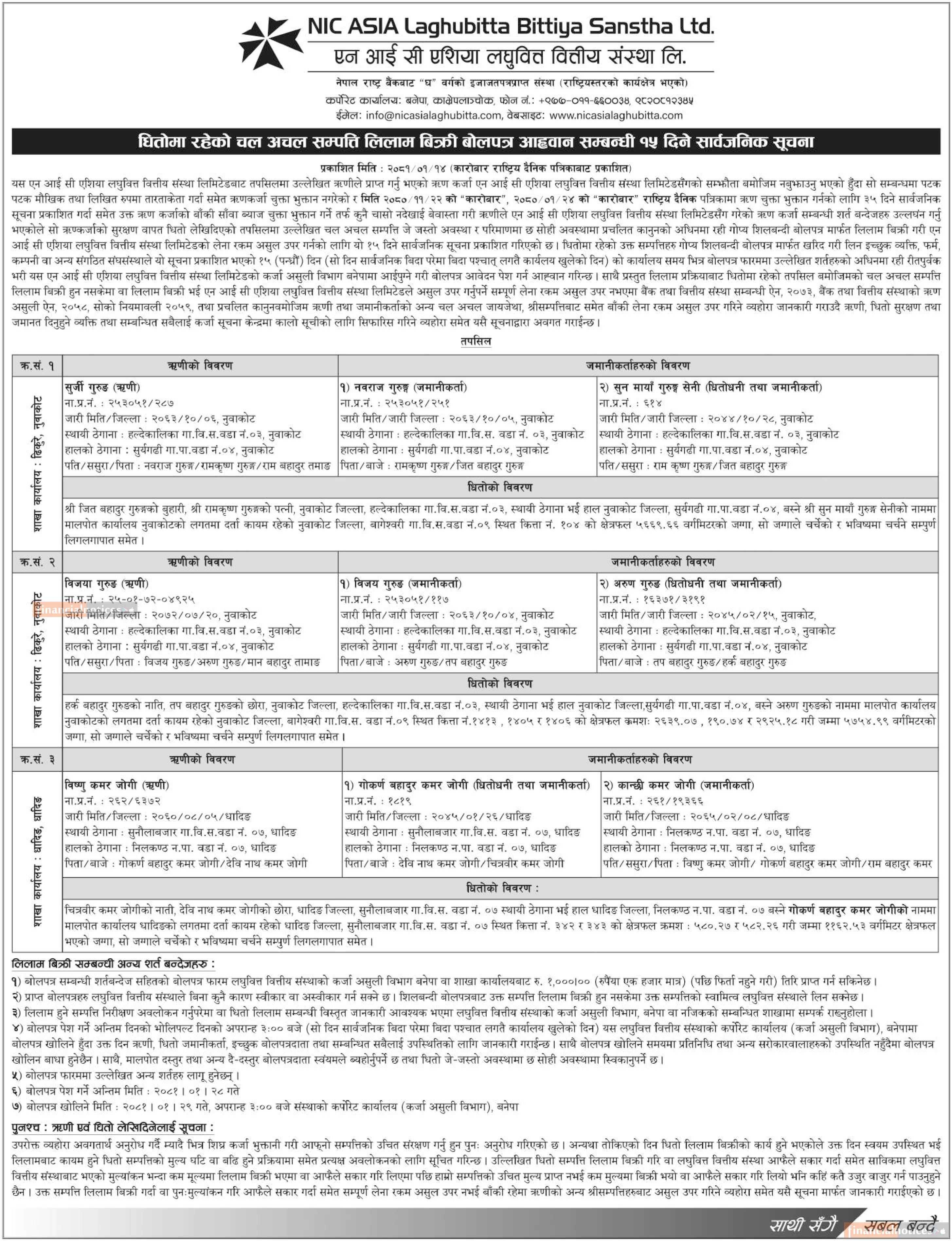 धितोमा रहेको चल अचल सम्पत्ति लिलाम बिक्री बोलपत्र आव्हान सम्बन्धी १५ दिने सूचना
