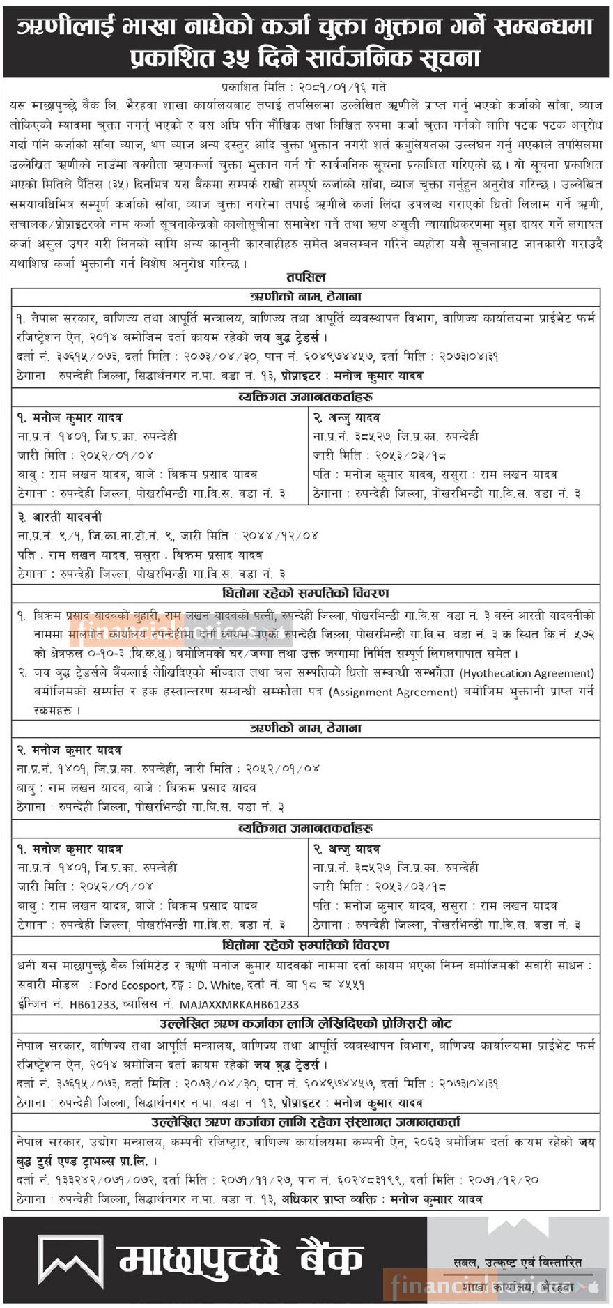ऋणीहरुलाई भाखा नाघेको कर्जा चुक्ता भुक्तान गर्ने सम्बन्धमा ३५ दिने सार्वजनिक सूचना