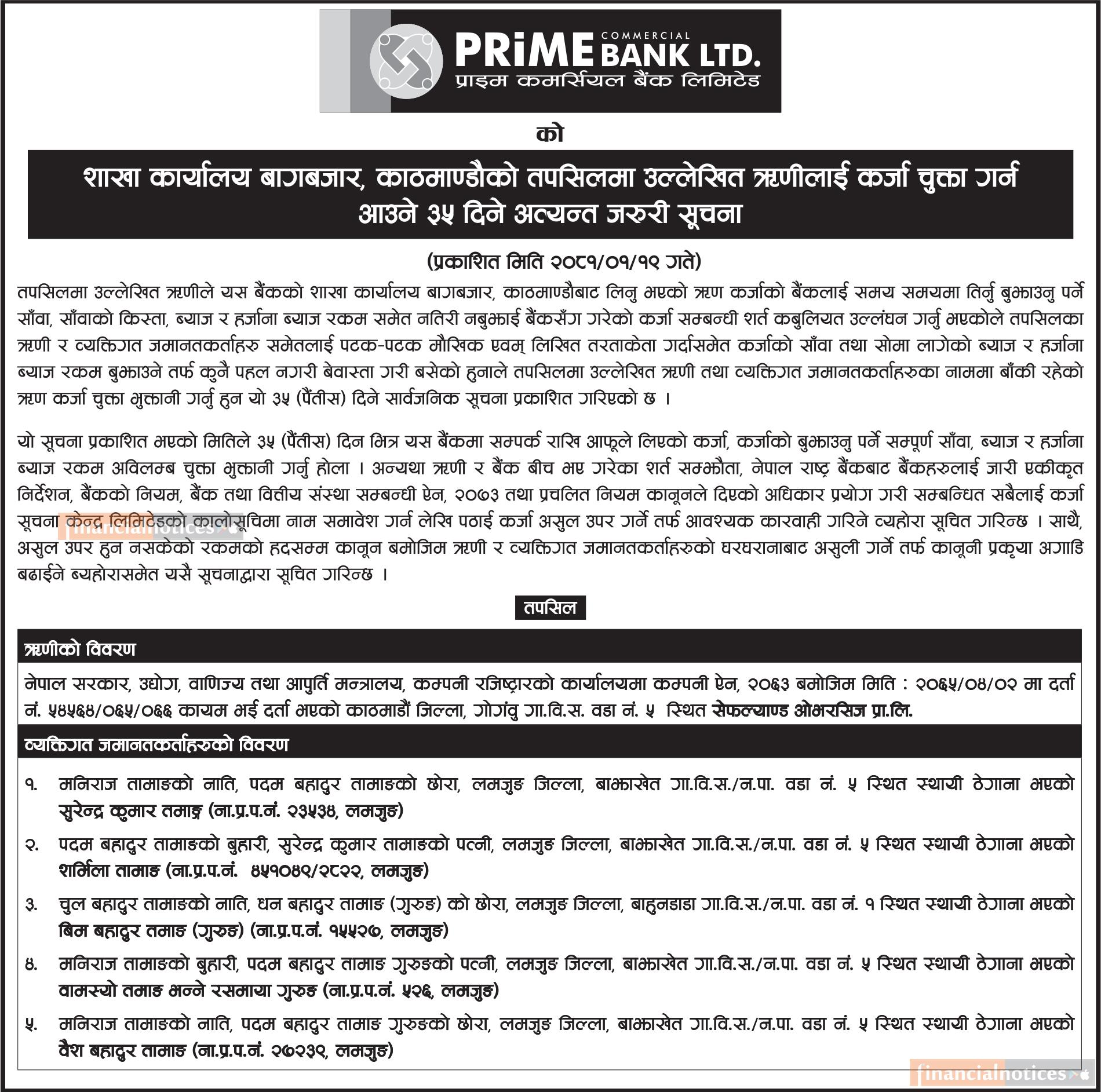 बागबजार काठमाडौँको तपसिलमा उल्लेखित ऋणीहरुलाई ऋणकर्जा चुक्ता भुक्तान गर्ने ३५ दिने सूचना