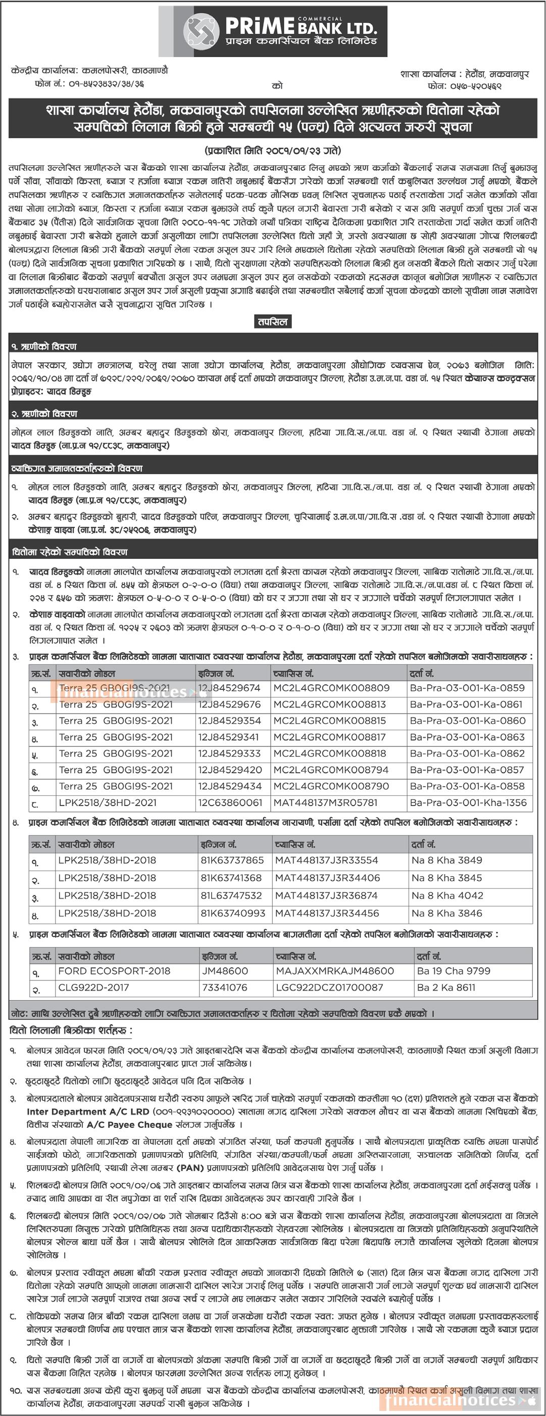 ऋणीहरुको धितोमा रहेको सम्पत्तिको लिलाम बिक्री हुने सम्बन्धी १५ दिने सूचना