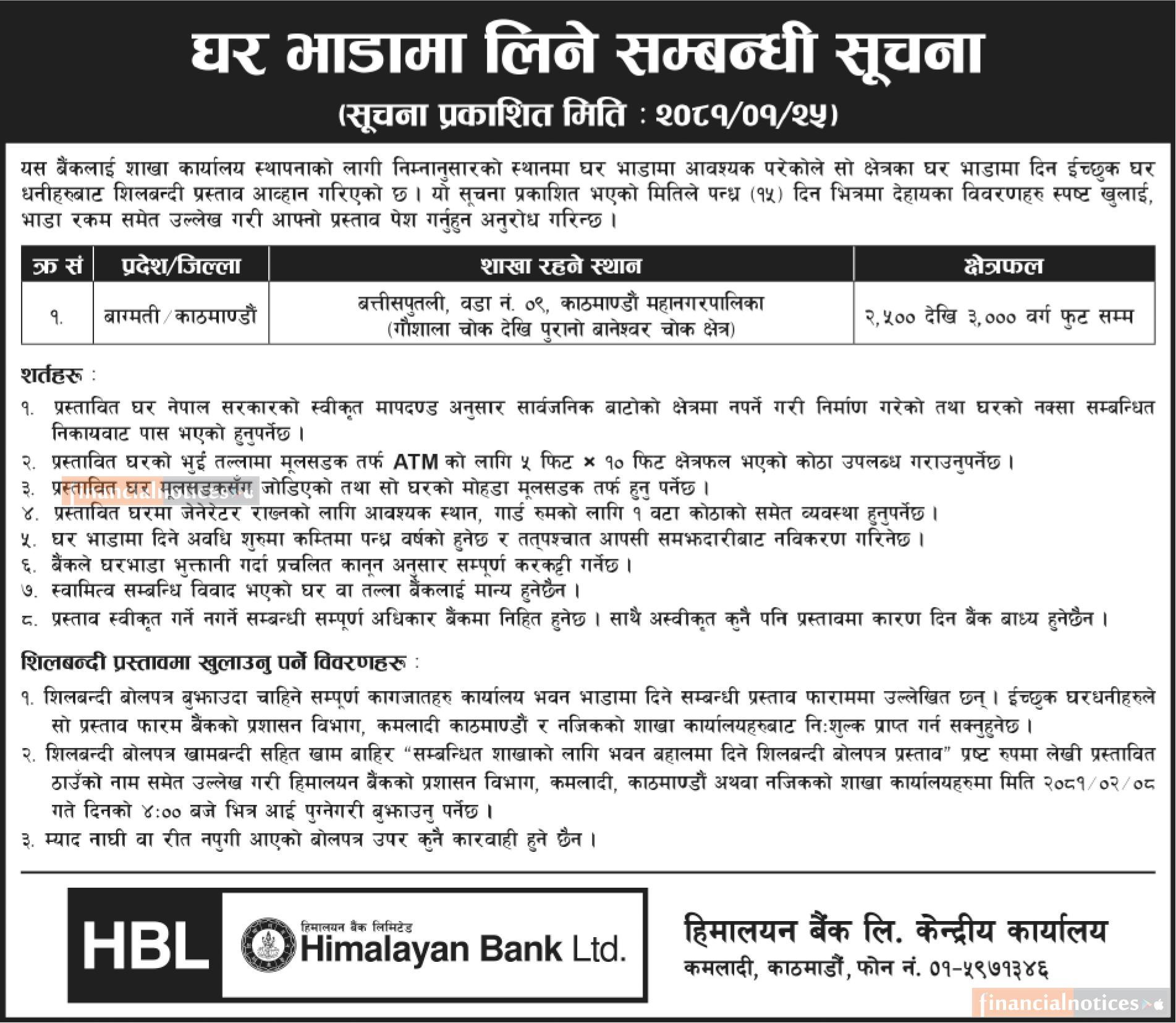 बैंकको शाखा संचालनका लागि घर भाडामा लिने सम्बन्धी सूचना -