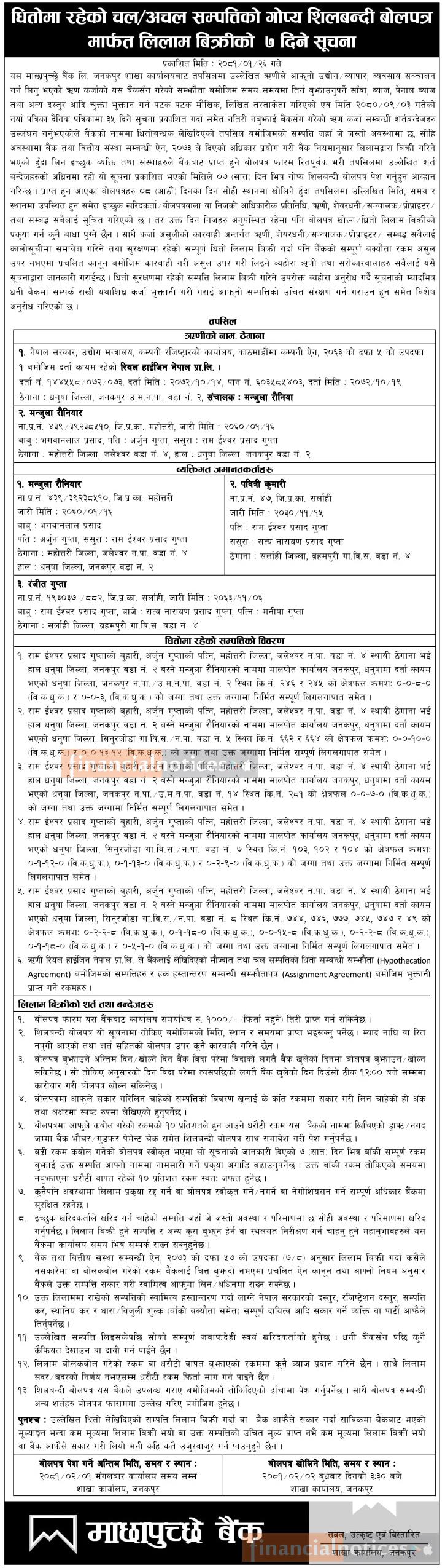 धितोमा रहेको चल अचल सम्पत्तिको गोप्य शिलबन्दी बोलपत्र मार्फत लिलाम बिक्रीको ७ दिने सूचना