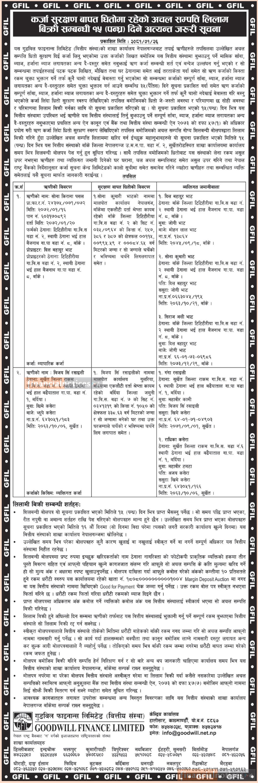 कर्जा सुरक्षण बापत धितोमा रहेको अचल सम्पत्ति लिलाम बिक्री सम्बन्धी १५ दिने सूचना