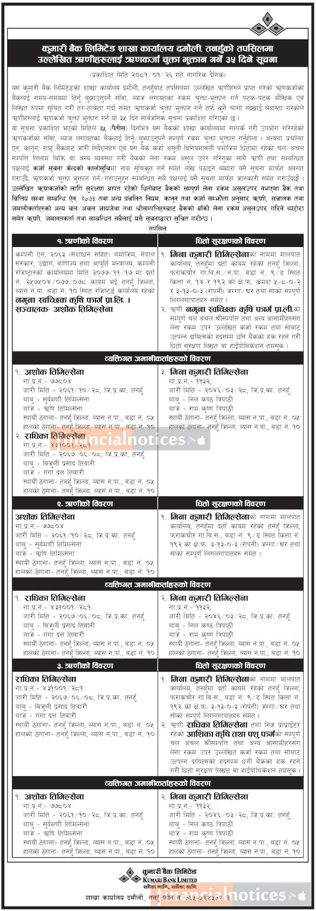 दमौली तनहुँको तपसिलमा उल्लेखित ऋणीहरुलाई ऋणकर्जा चुक्ता भुक्तान गर्ने ३५ दिने सूचना