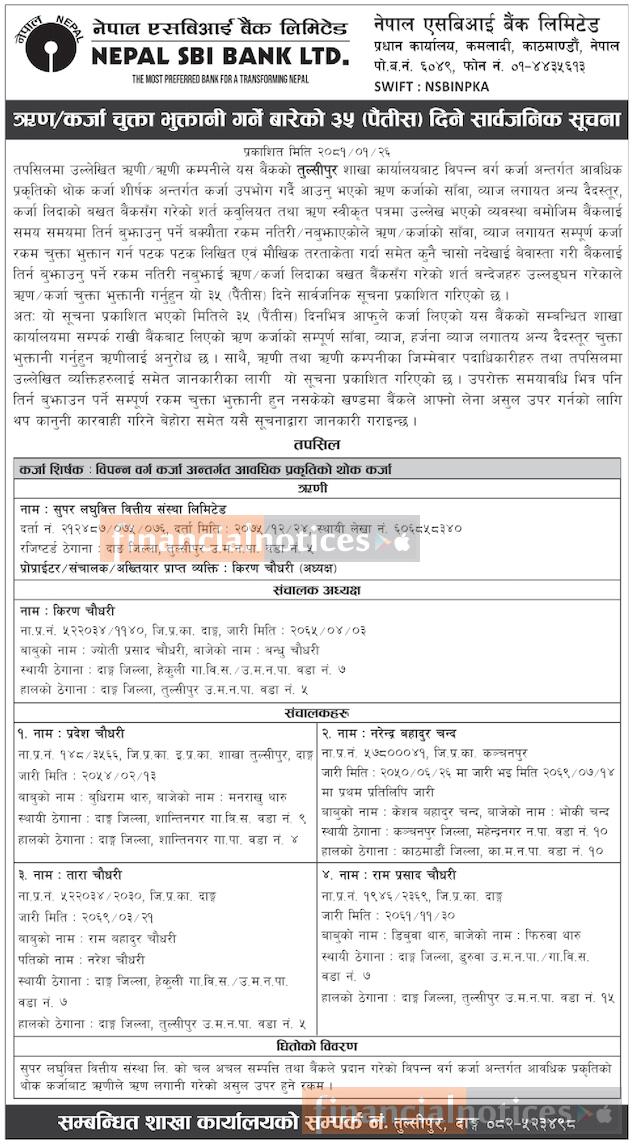 ऋणकर्जा चुक्ता भुक्तानी गर्ने बारेको ३५ दिने सार्वजनिक सूचना