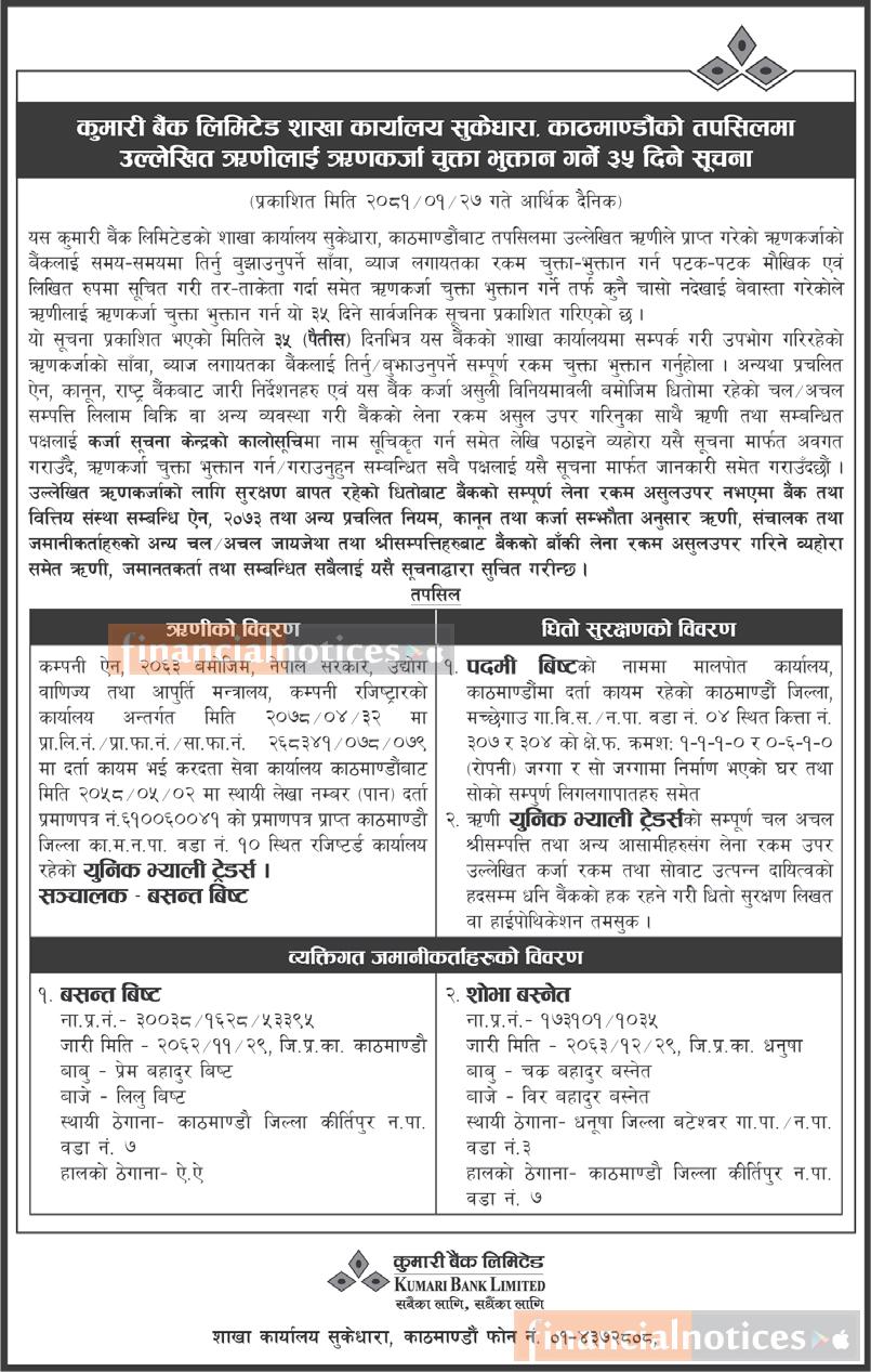 काठमाडौंको तपसिलमा उल्लेखित ऋणीहरुलाई ऋणकर्जा चुक्ता भुक्तान गर्ने ३५ दिने सूचना