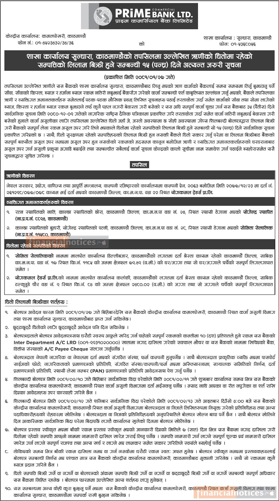 ऋणीहरुको धितोमा रहेको सम्पत्तिको लिलाम बिक्री हुने सम्बन्धी १५ दिने सूचना