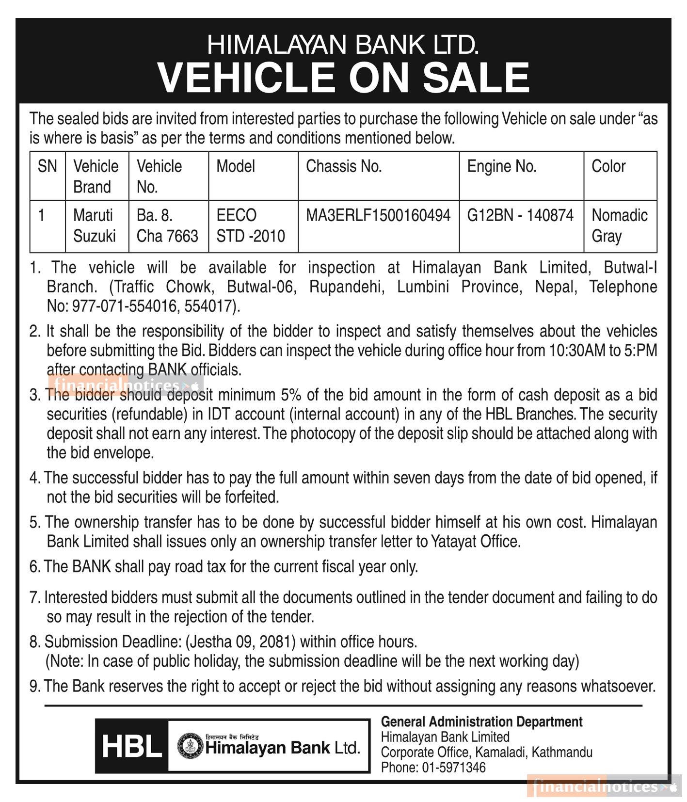 Himalayan Bank Limited invites sealed bids from interested parties for the purchase of the following vehicle under "as is where is basis," subject to the terms and conditions outlined below: