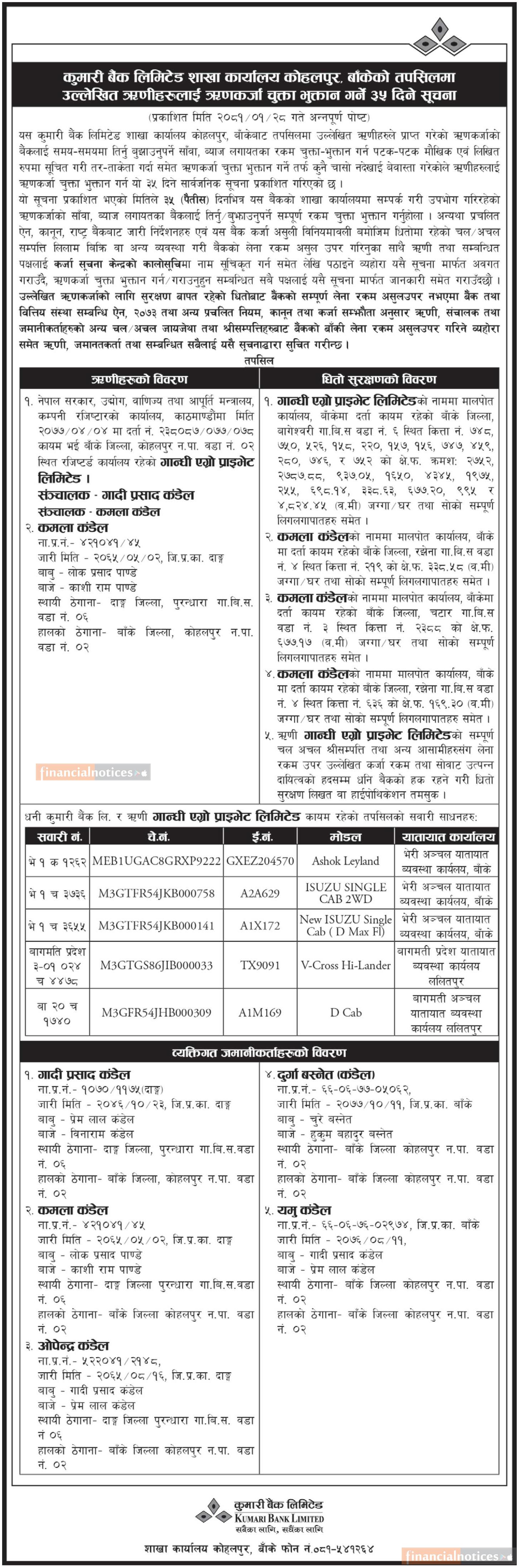 Kumari Bank Auction Notice for Non-Banking Assets at Mahendranagar, Kanchanpur -