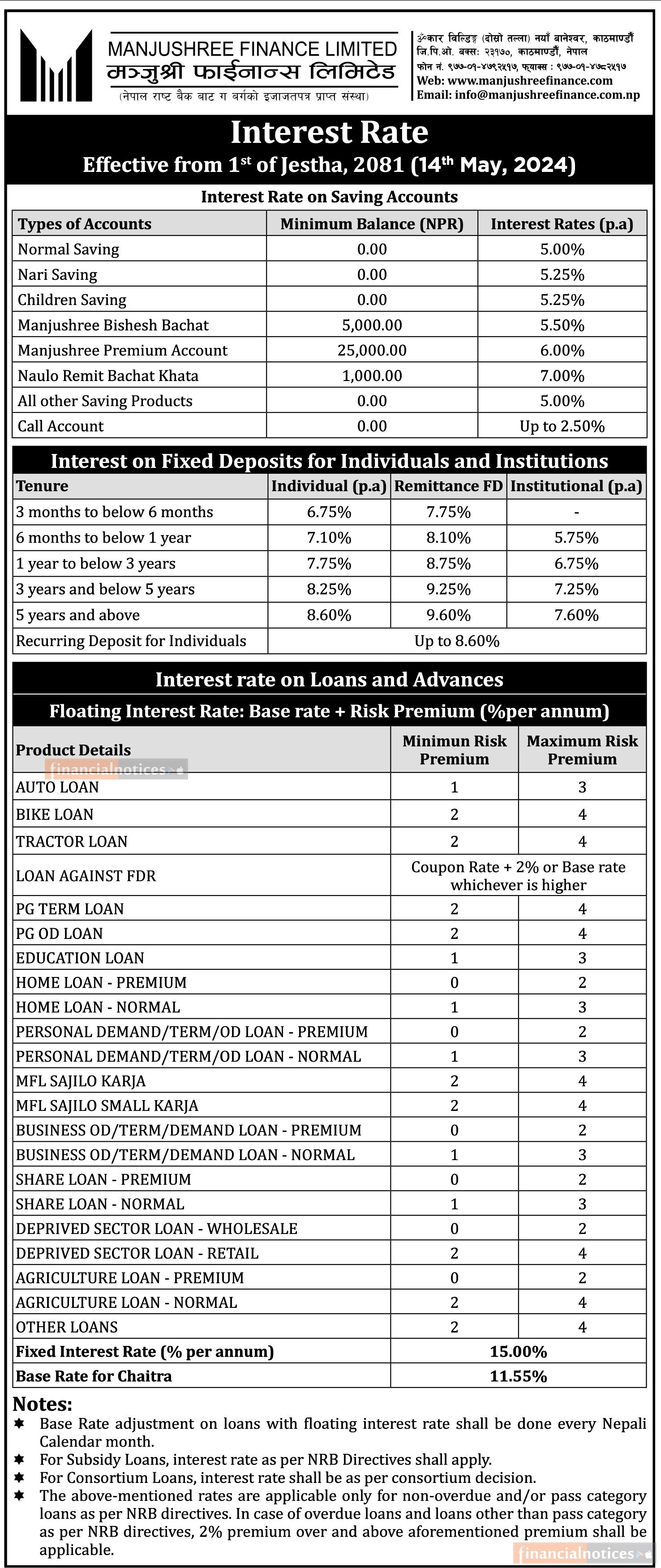 मञ्जुश्री फाइनान्सको जेष्ठदेखि नयाँ ब्याजदर लागु हुने सम्बन्धी सूचना