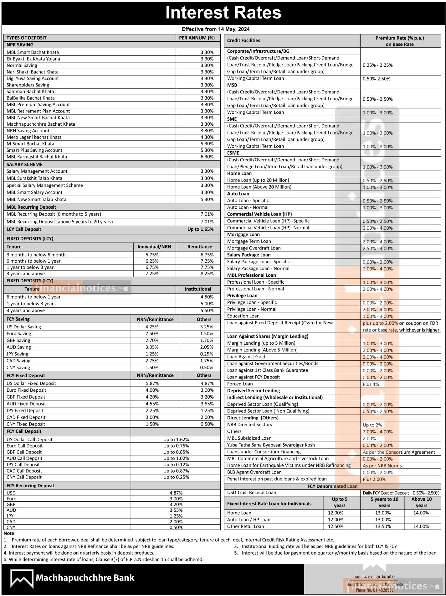 माछापुच्छ्रे बैंकको ब्याजदर परिवर्तन, जेष्ठ १ गतेदेखि कुन खातामा कति पुग्यो ?