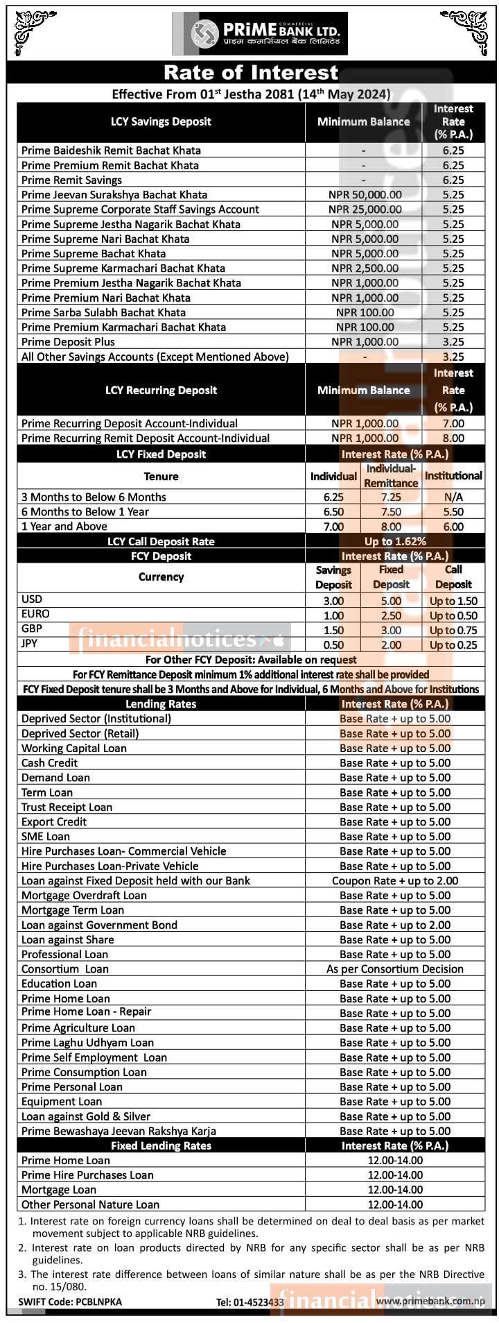 जेष्ठ एक गतेदेखि लागुहुने गरी प्राइम बैंकको नयाँ ब्याजदर सार्वजनिक