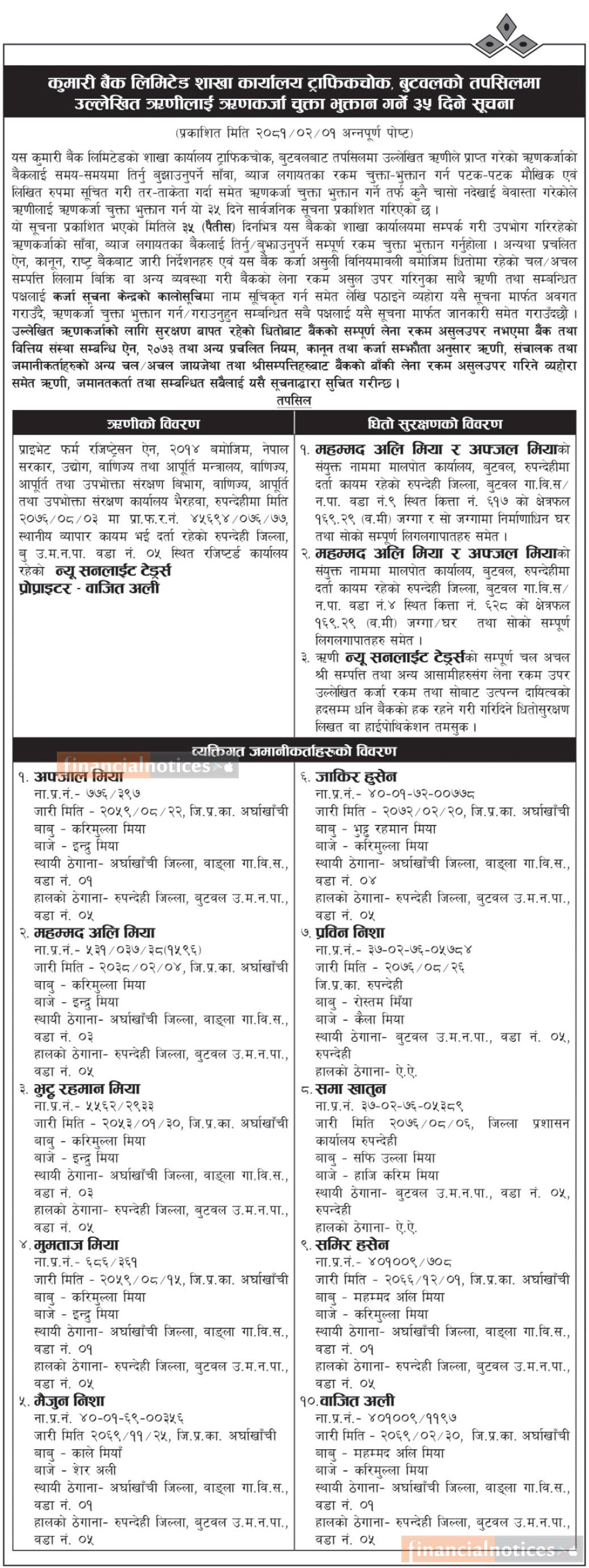 बुटवलको तपसिलमा उल्लेखित ऋणीहरुलाई ऋणकर्जा चुक्ता भुक्तान गर्ने ३५ दिने सूचना