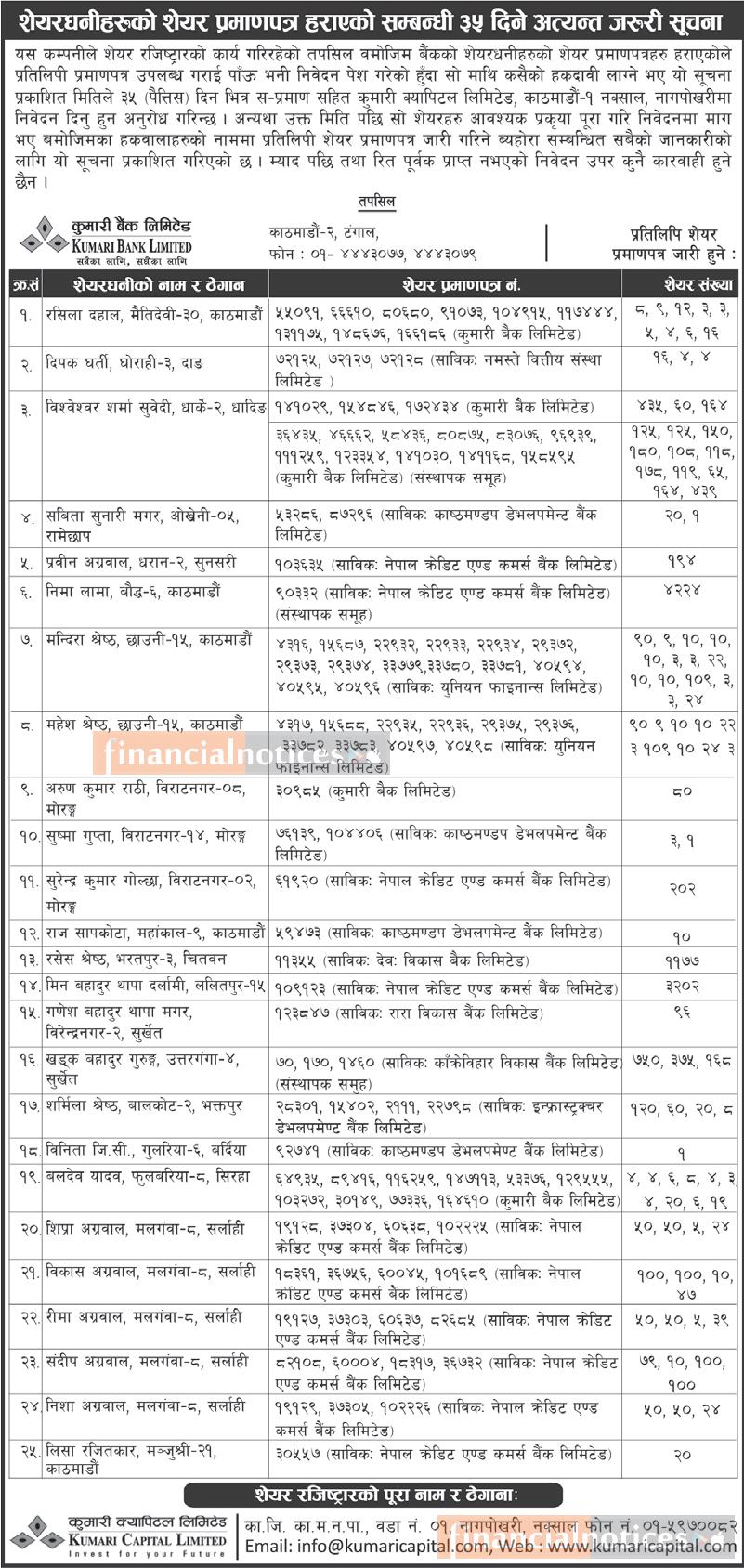 शेयरधनीहरुको शेयरप्रमाणपत्र हराएको सम्बन्धी ३५ दिने सूचना