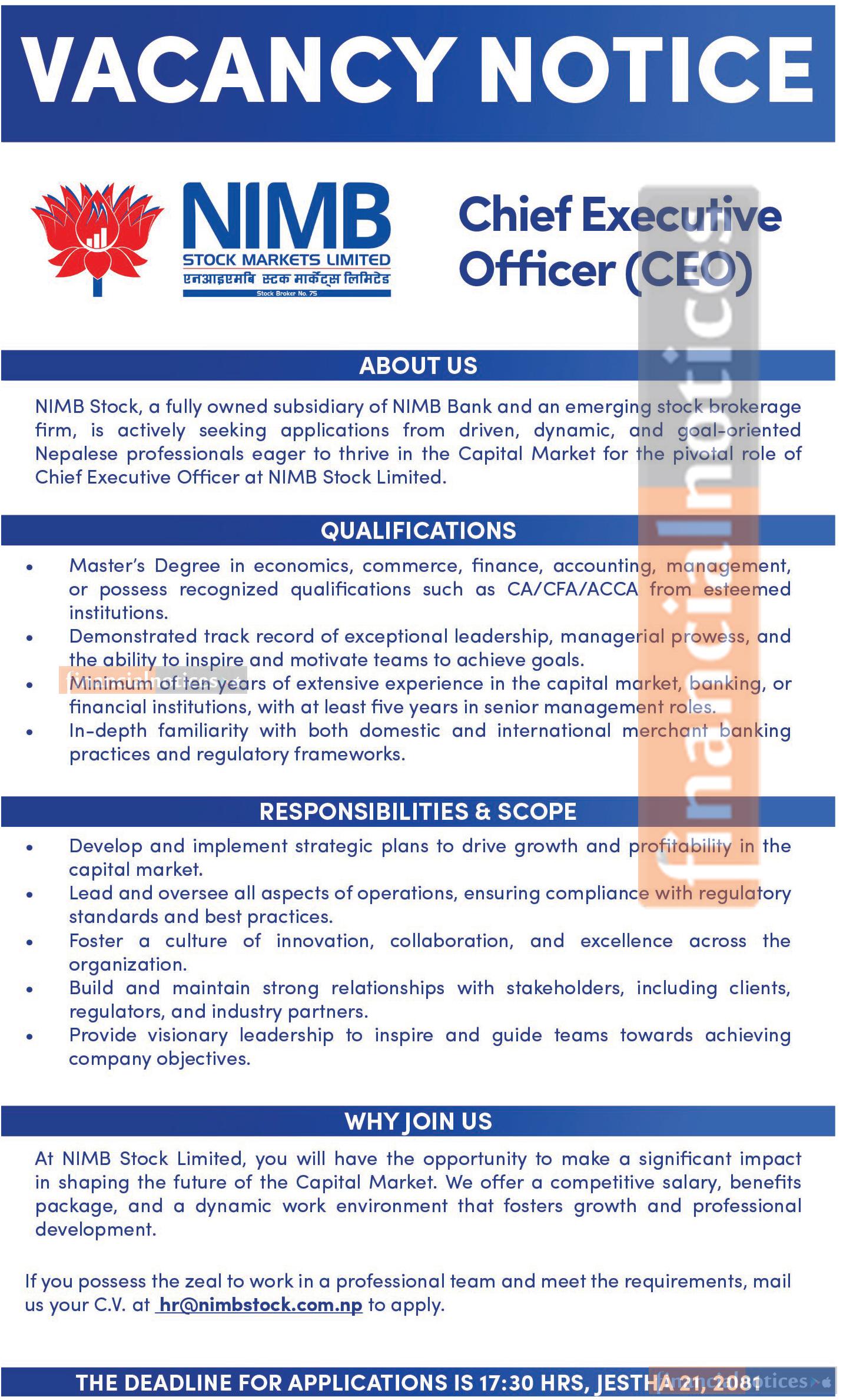 Kathmandu, Nepal - NIMB Stock Limited, a wholly owned subsidiary of NIMB Bank and a rapidly growing stock brokerage firm, is on the lookout for a driven, dynamic, and goal-oriented Nepalese professional to step into the pivotal role of Chief Executive Officer (CEO).