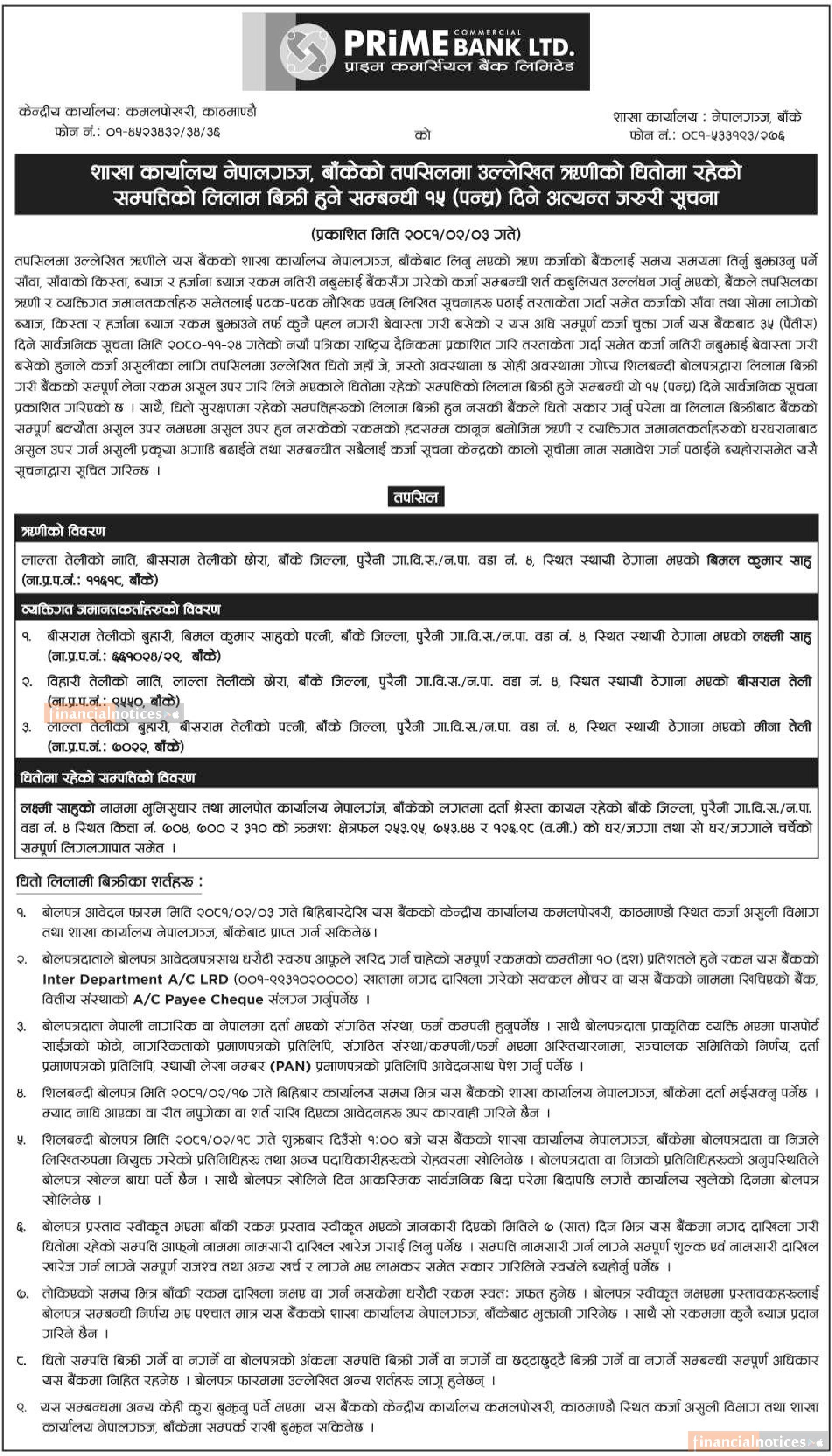 ऋणीहरुको धितोमा रहेको सम्पत्तिको लिलाम बिक्री हुने सम्बन्धी १५ दिने सूचना