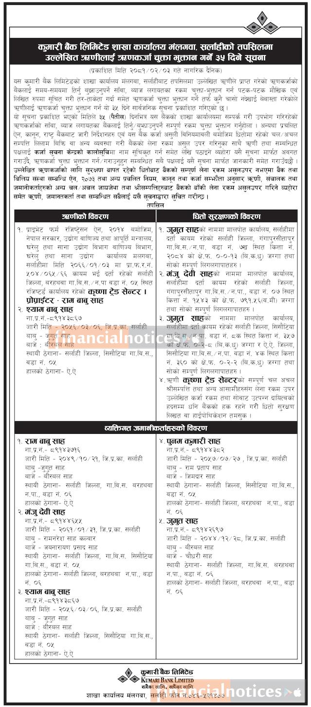 सर्लाहीको तपसिलमा उल्लेखित ऋणीहरुलाई ऋणकर्जा चुक्ता भुक्तान गर्ने ३५ दिने सूचना