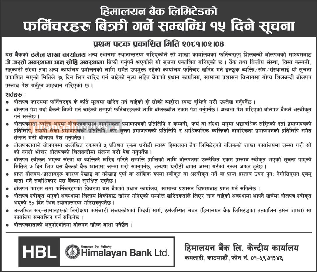 फर्निचरहरु बिक्री गर्ने बारे हिमालयन बैंकको सूचना