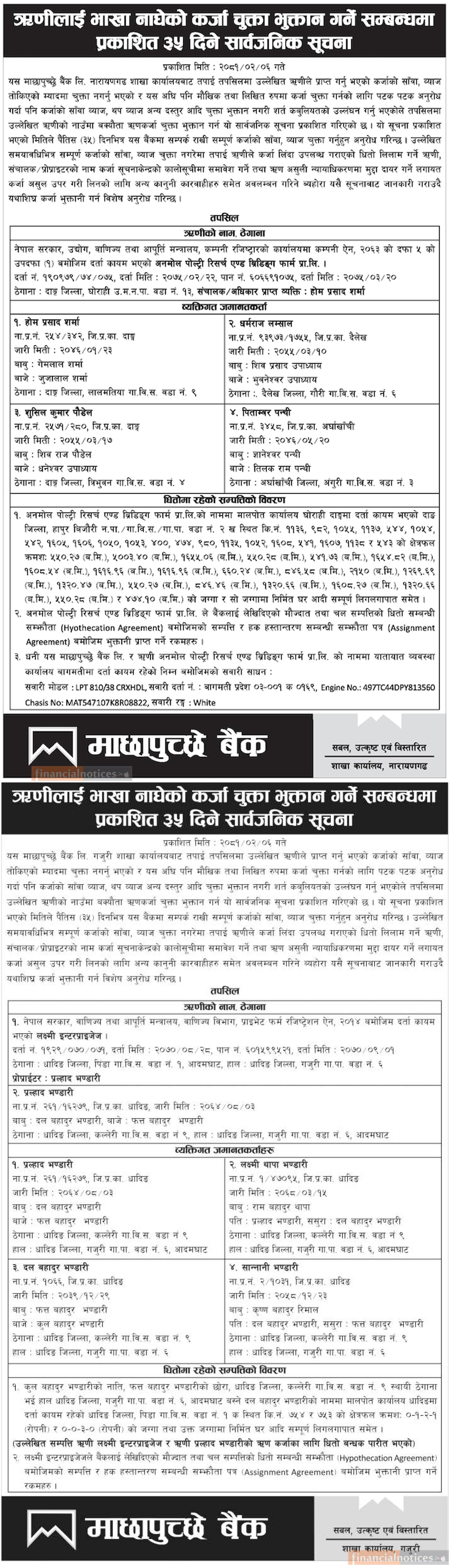 ऋणीहरुलाई भाखा नाघेको कर्जा चुक्ता भुक्तान गर्ने सम्बन्धमा ३५ दिने सार्वजनिक सूचना