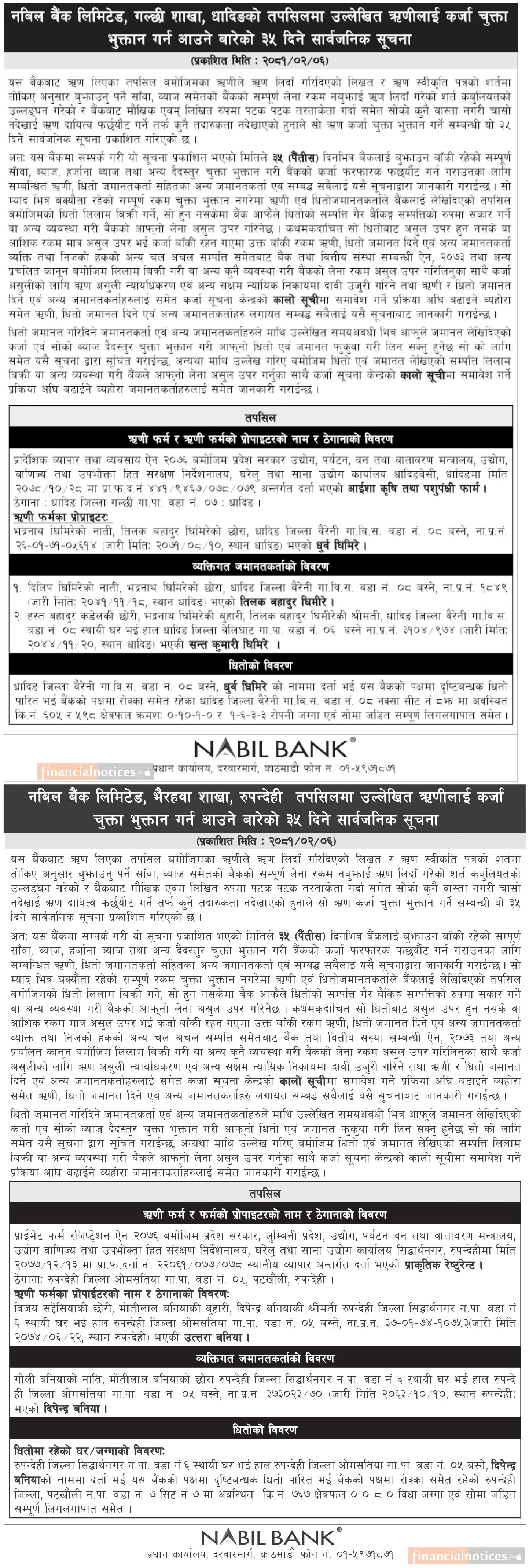 धादिङ र रुपन्देहीको तपसिलमा ऋणीहरुलाई कर्जा चुक्ता भुक्तान गर्न आउने बारेको ३५ दिने सूचना