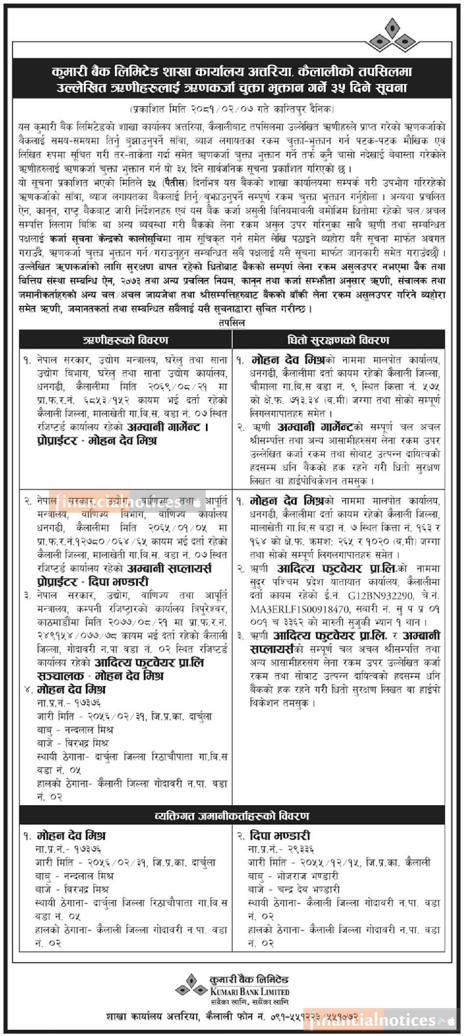 कैलालीको तपसिलमा उल्लेखित ऋणीहरुलाई ऋणकर्जा चुक्ता भुक्तान गर्ने ३५ दिने सूचना