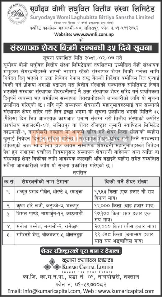 संस्थापक सेयर बिक्री सम्बन्धी ३५ दिने सूचना