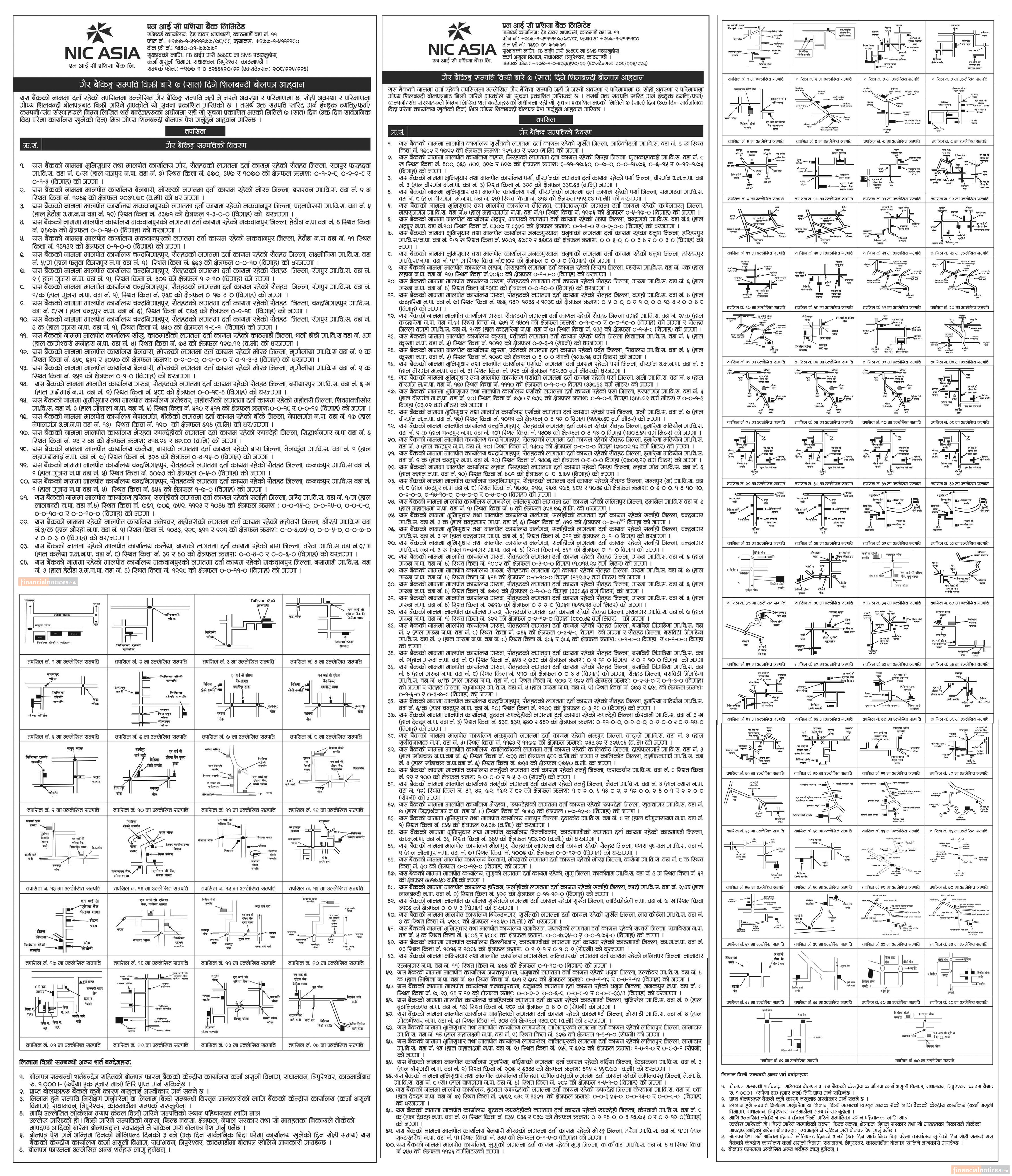एनआइसी एशिया बैंकले गैर बैंकिङ सम्वपत्त विक्रीका लागि सात दिने शिलबन्दी बोलपत्र आह्वानको सूचना सार्वजनिक गरेको छ । बैंकले एकै पटक धेरै ठाउँको घरजग्गा बिक्री गर्दै गर्न लागेको सूचनामा उल्लेख छ ।
