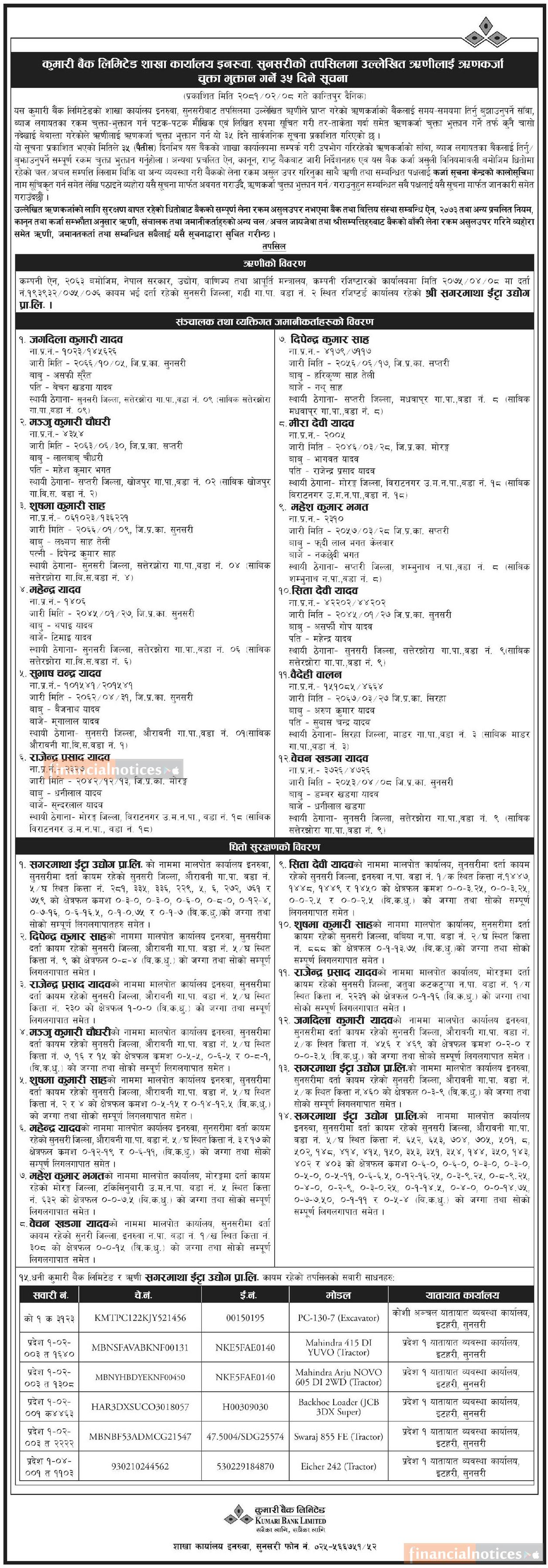 सुनसरीको तपसिलमा उल्लेखित ऋणीहरुलाई ऋणकर्जा चुक्ता भुक्तान गर्ने ३५ दिने सूचना