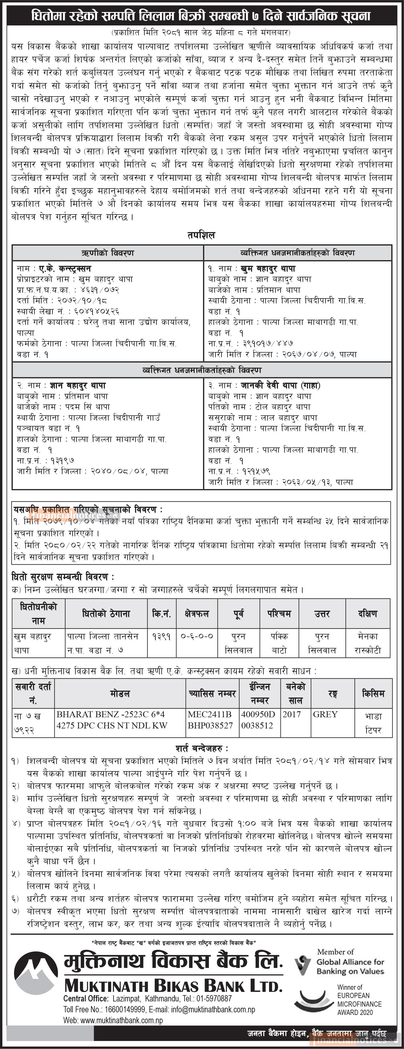 धितोमा रहेको सम्पत्ति लिलाम बिक्री सम्बन्धी ७ दिने सार्वजनिक सूचना