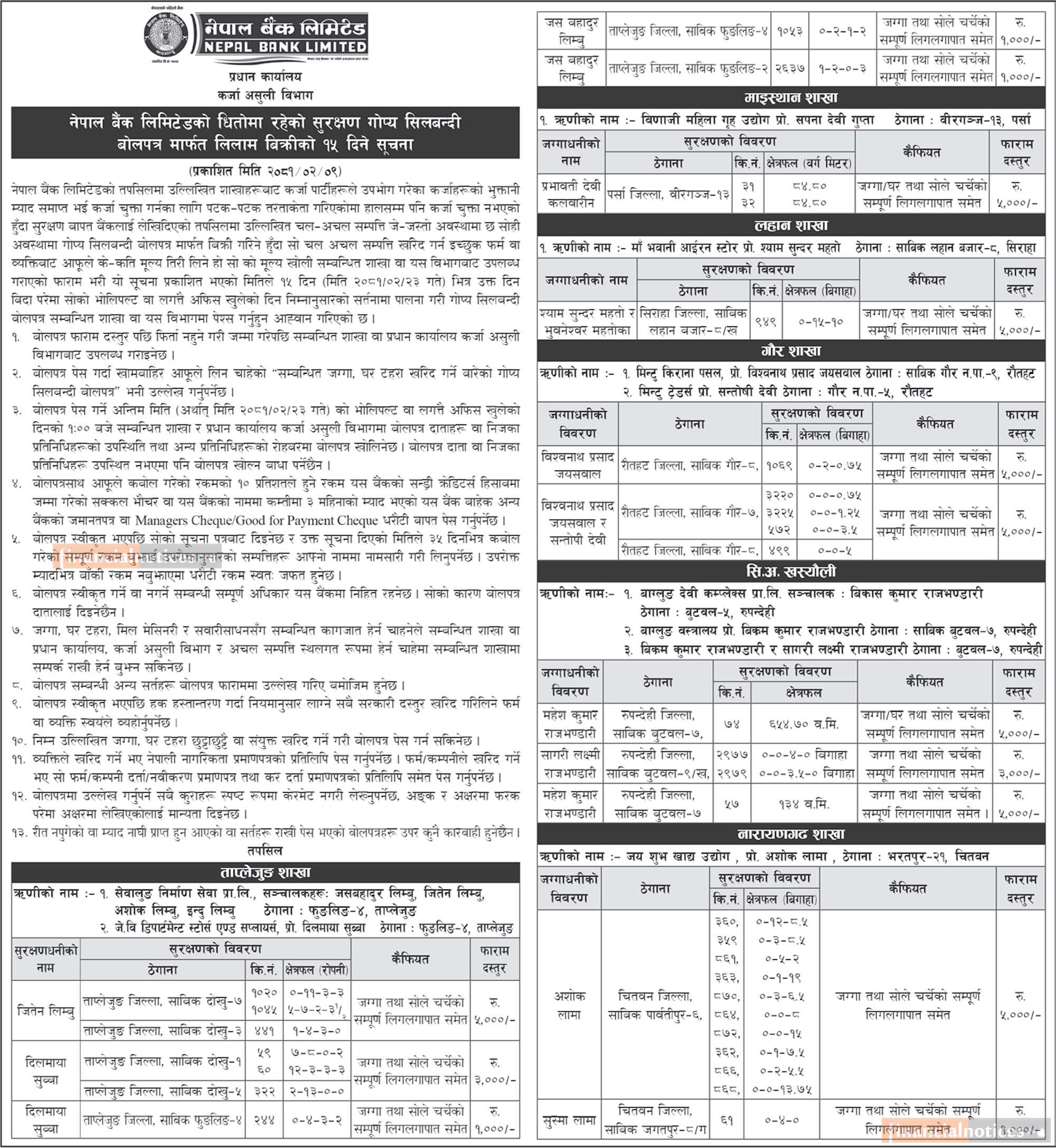 धितोमा रहेको सुरक्षण गोप्य शिलबन्दी बोलपत्र मार्फत् लिलाम बिक्रीको १५ दिने सूचना