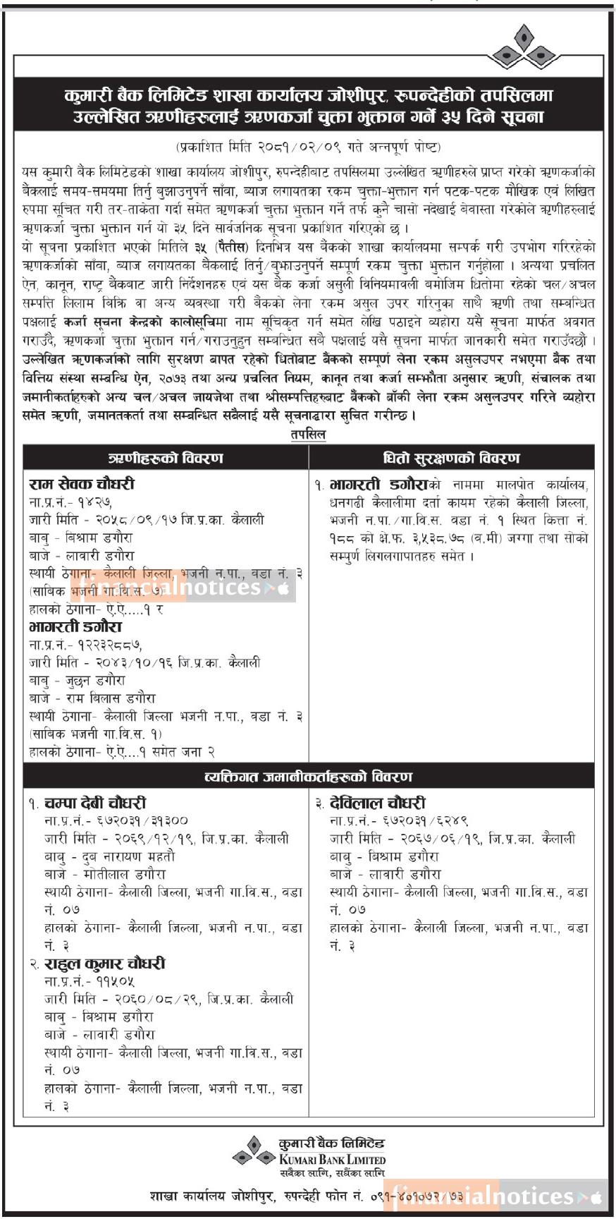 रुपन्देहीको तपसिलमा उल्लेखित ऋणीहरुलाई ऋणकर्जा चुक्ता भुक्तान गर्ने ३५ दिने सूचना
