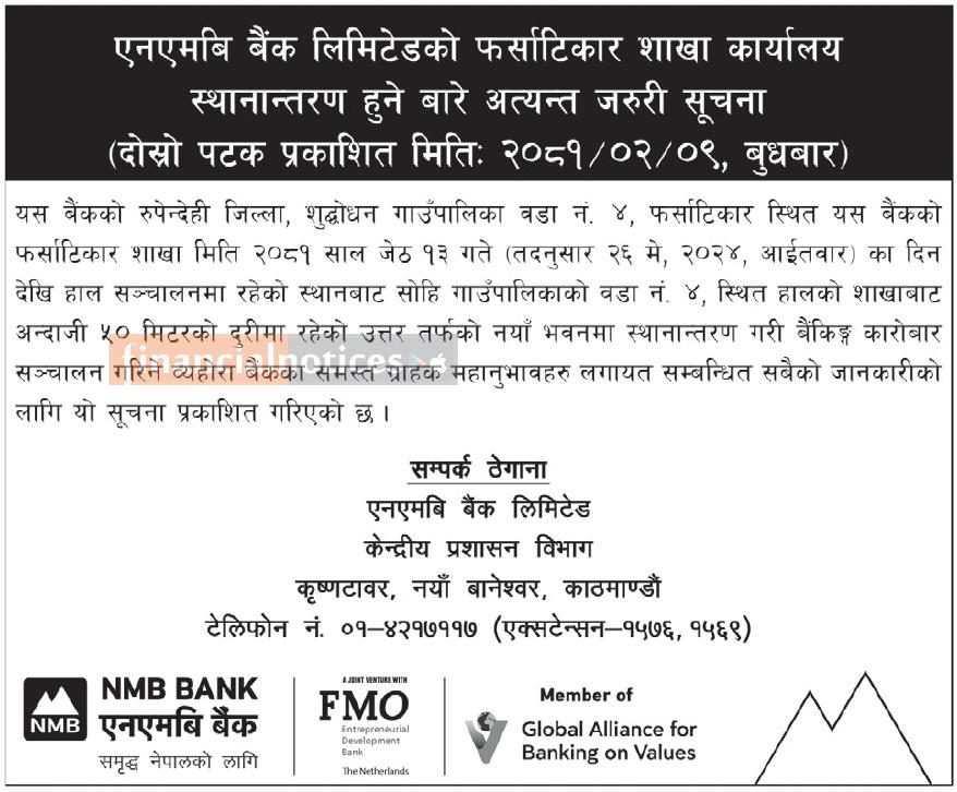 एनएमबि बैंकको शाखा कार्यालय स्थानान्तरण हुनेबारे सूचना -