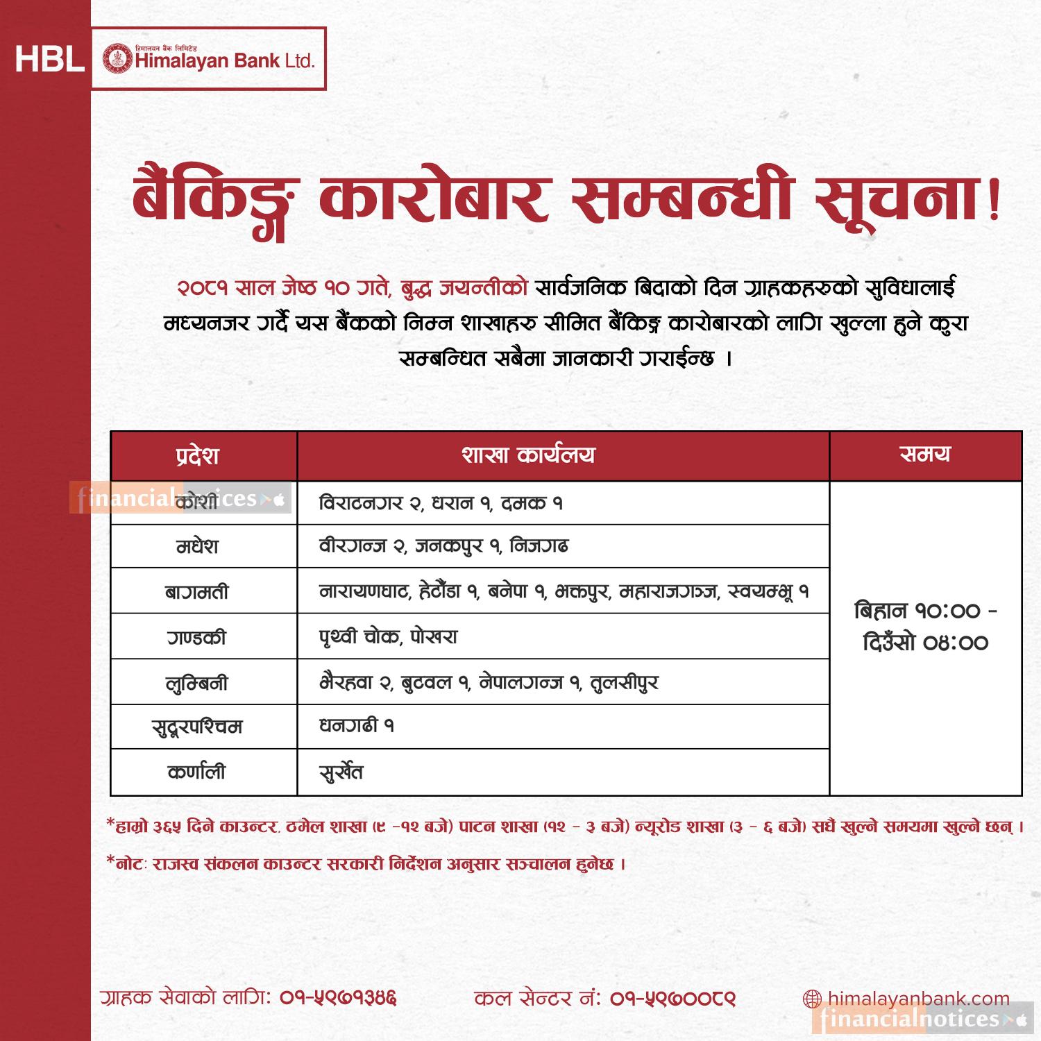 बैंकिङ्ग कारोबार खुल्ला रहने सम्बन्धी सूचना