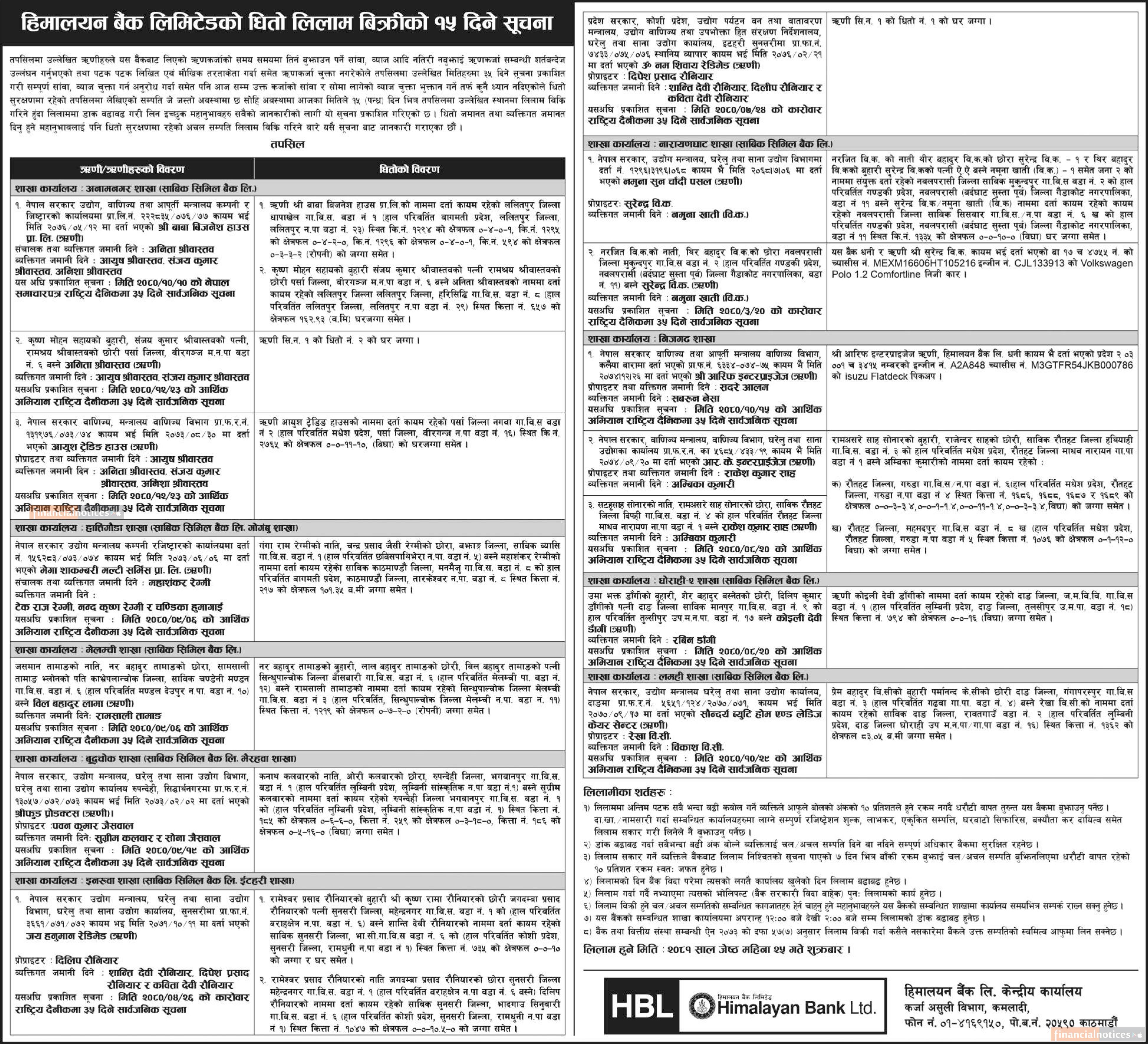 हिमालयन बैंकको धितो लिलाम बिक्रीको १५ दिने सूचना