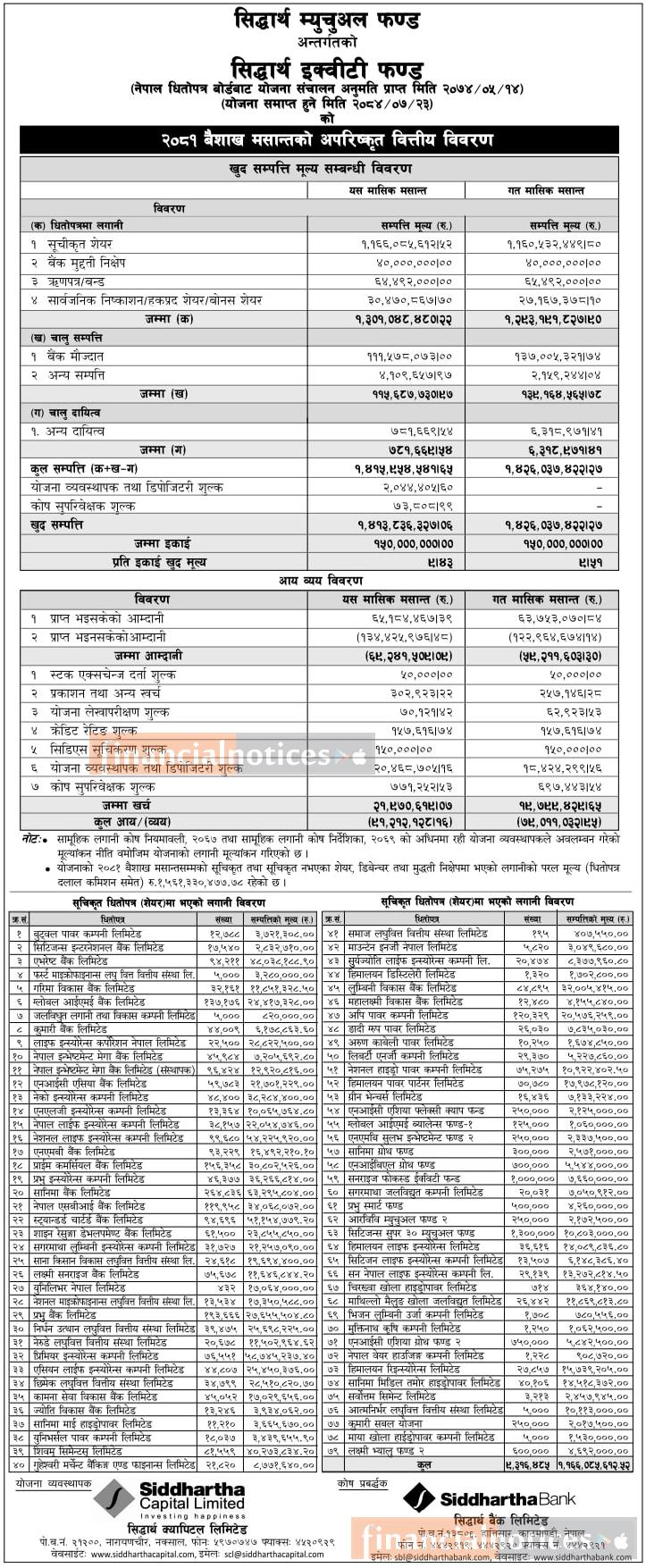Siddhartha Capital published Siddhartha Equity Fund NAV till Baisakh, 2081
