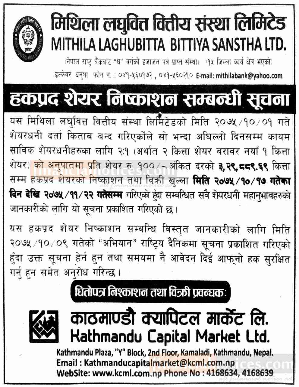 हकप्रद शेयर निष्काशनको सूचना