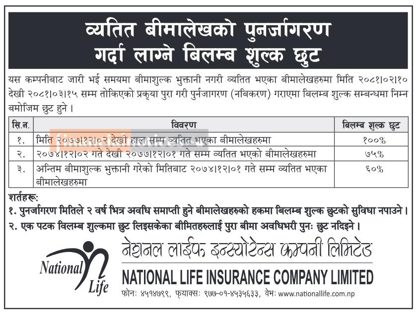 व्यतित बीमालेखको पुनर्जागरण गर्दा लाग्ने बिलम्ब शुल्क छुटबारे सूचना -