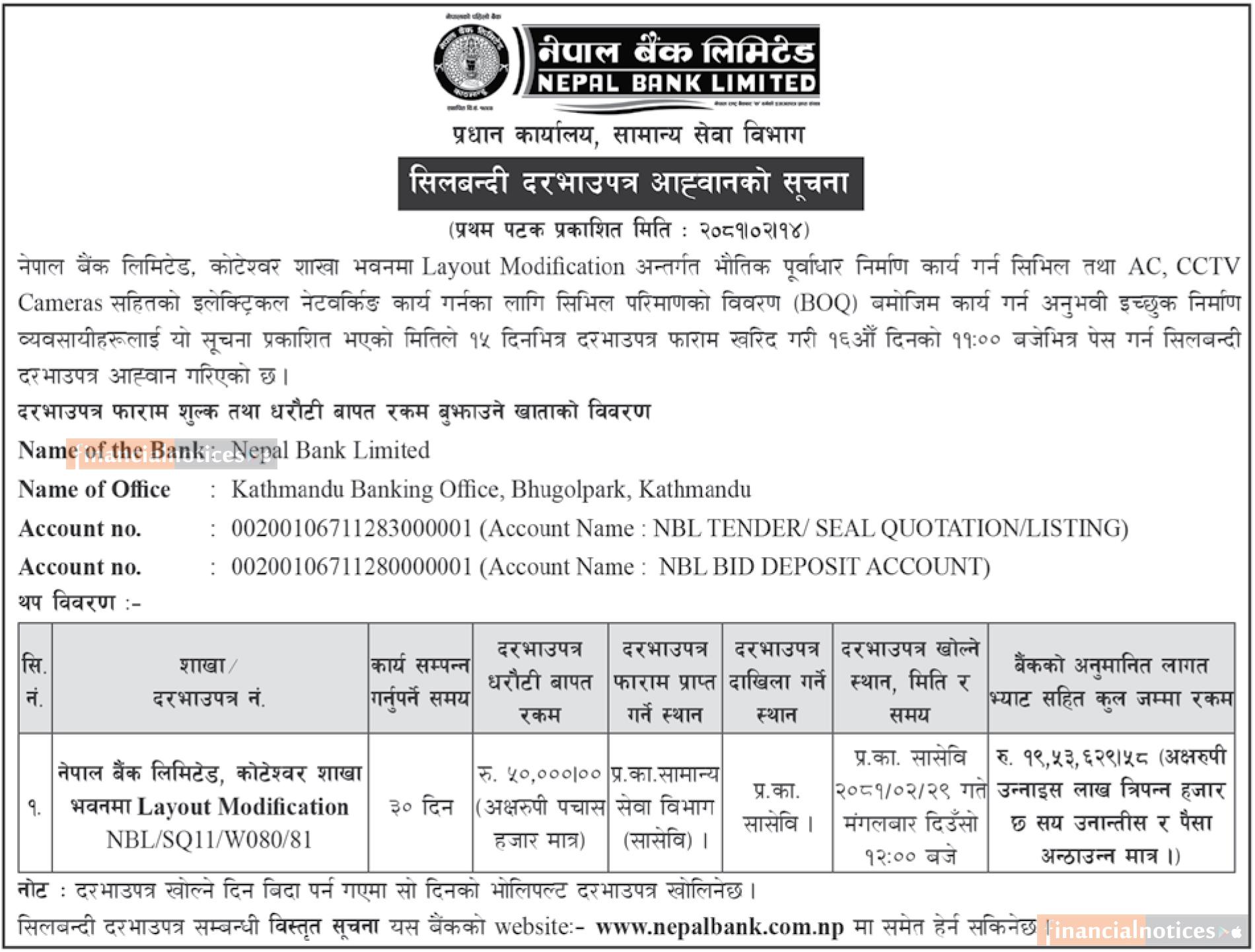 नेपाल बैंकको शिलबन्दी दरभाउपत्र आह्वानको सूचना -