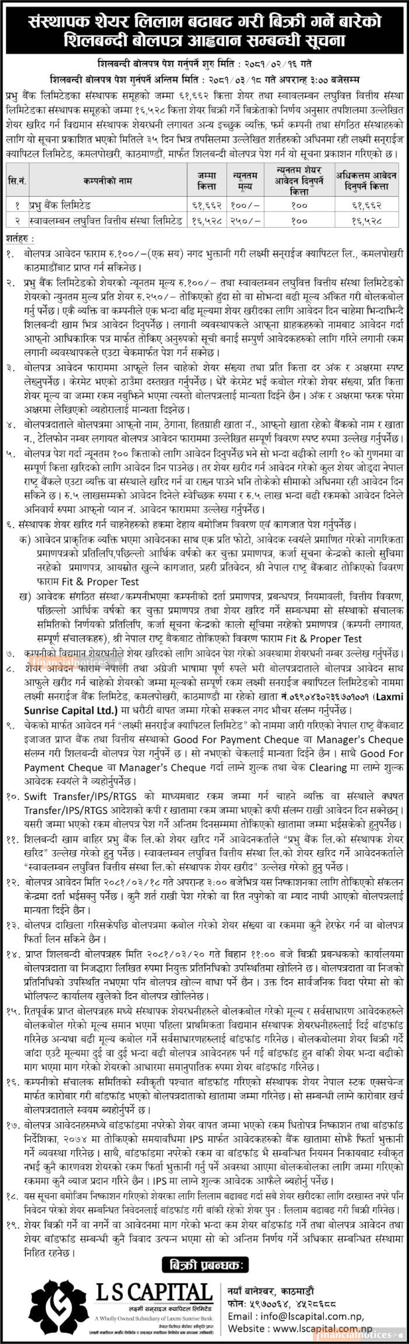 प्रभु बैंक र स्वावलम्बन लघुवित्तको संस्थापक शेयर बिक्रीबारे सूचना -