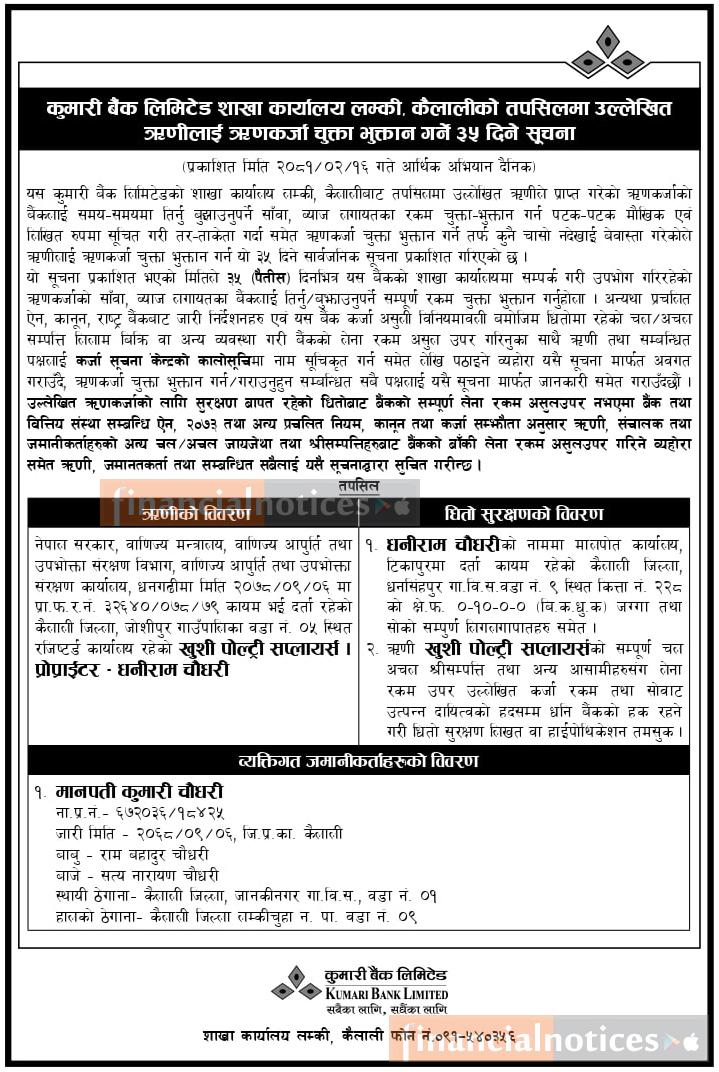 कैलालीको तपसिलमा उल्लेखित ऋणीहरुलाई ऋणकर्जा चुक्ता भुक्तान गर्ने ३५ दिने सूचना