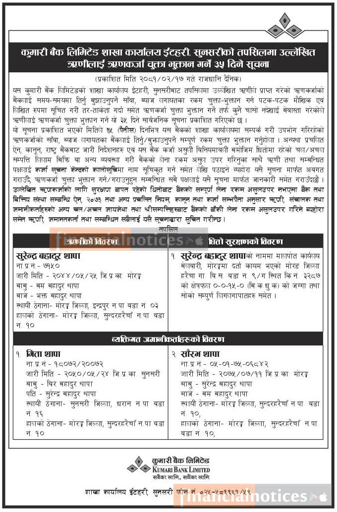 सुनसरीको तपसिलमा उल्लेखित ऋणीहरुलाई ऋणकर्जा चुक्ता भुक्तान गर्ने ३५ दिने सूचना
