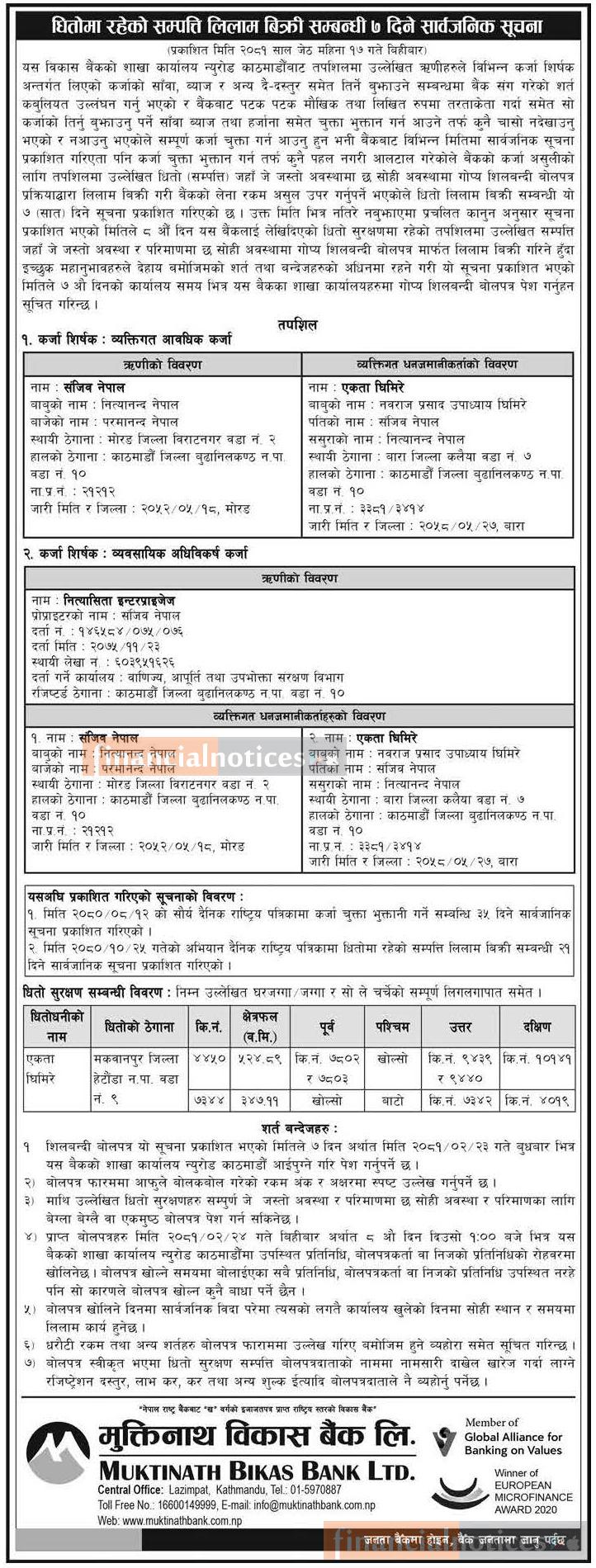धितोमा रहेको सम्पत्ति लिलाम बिक्री सम्बन्धी ७ दिने सार्वजनिक सूचना