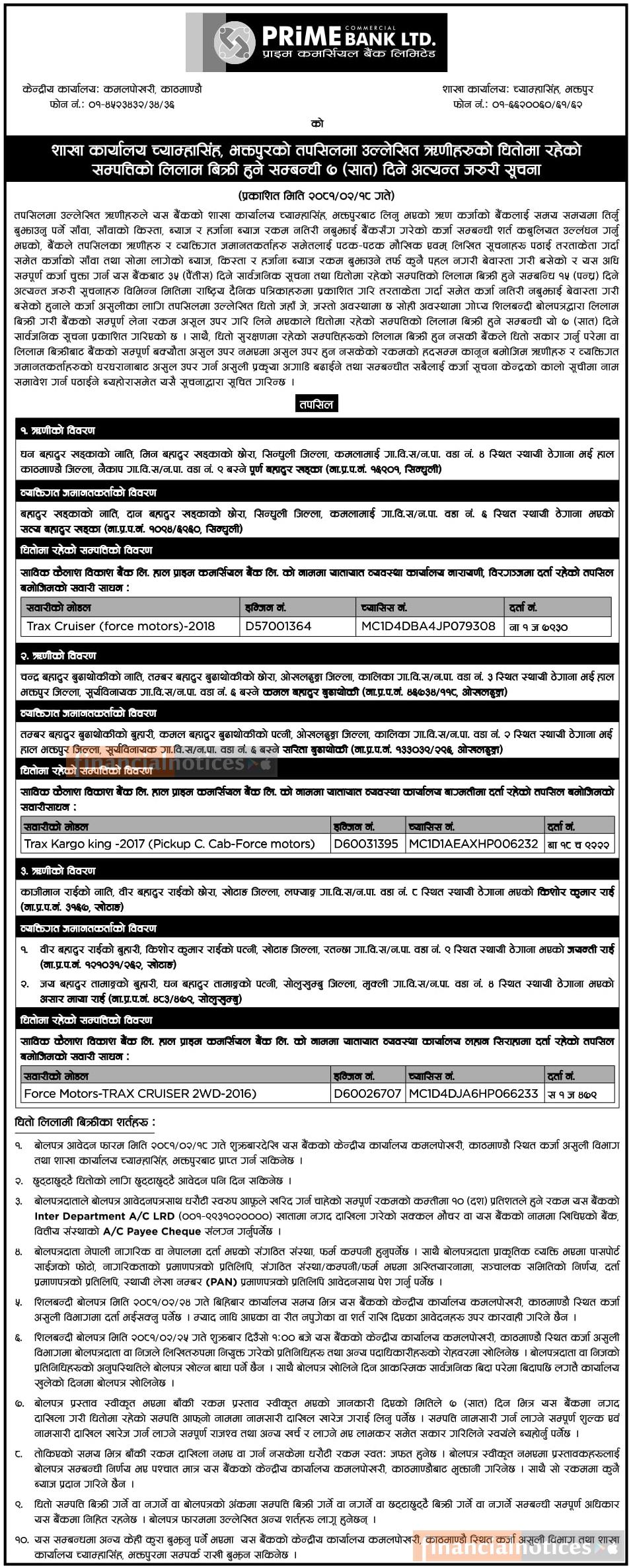 ऋणीहरुको धितोमा रहेको सम्पत्तिको लिलाम बिक्री हुने सम्बन्धी ७ दिने सूचना