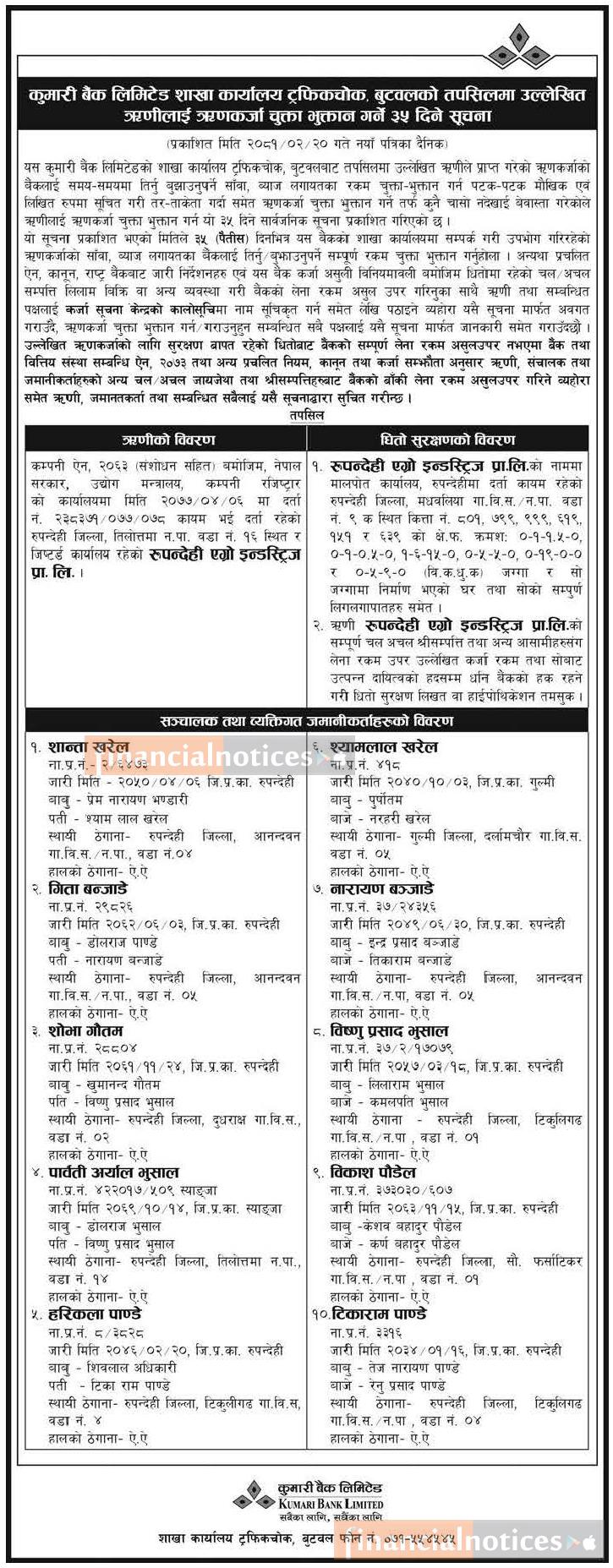 बुटवलको तपसिलमा उल्लेखित ऋणीहरुलाई ऋणकर्जा चुक्ता भुक्तान गर्ने ३५ दिने सूचना