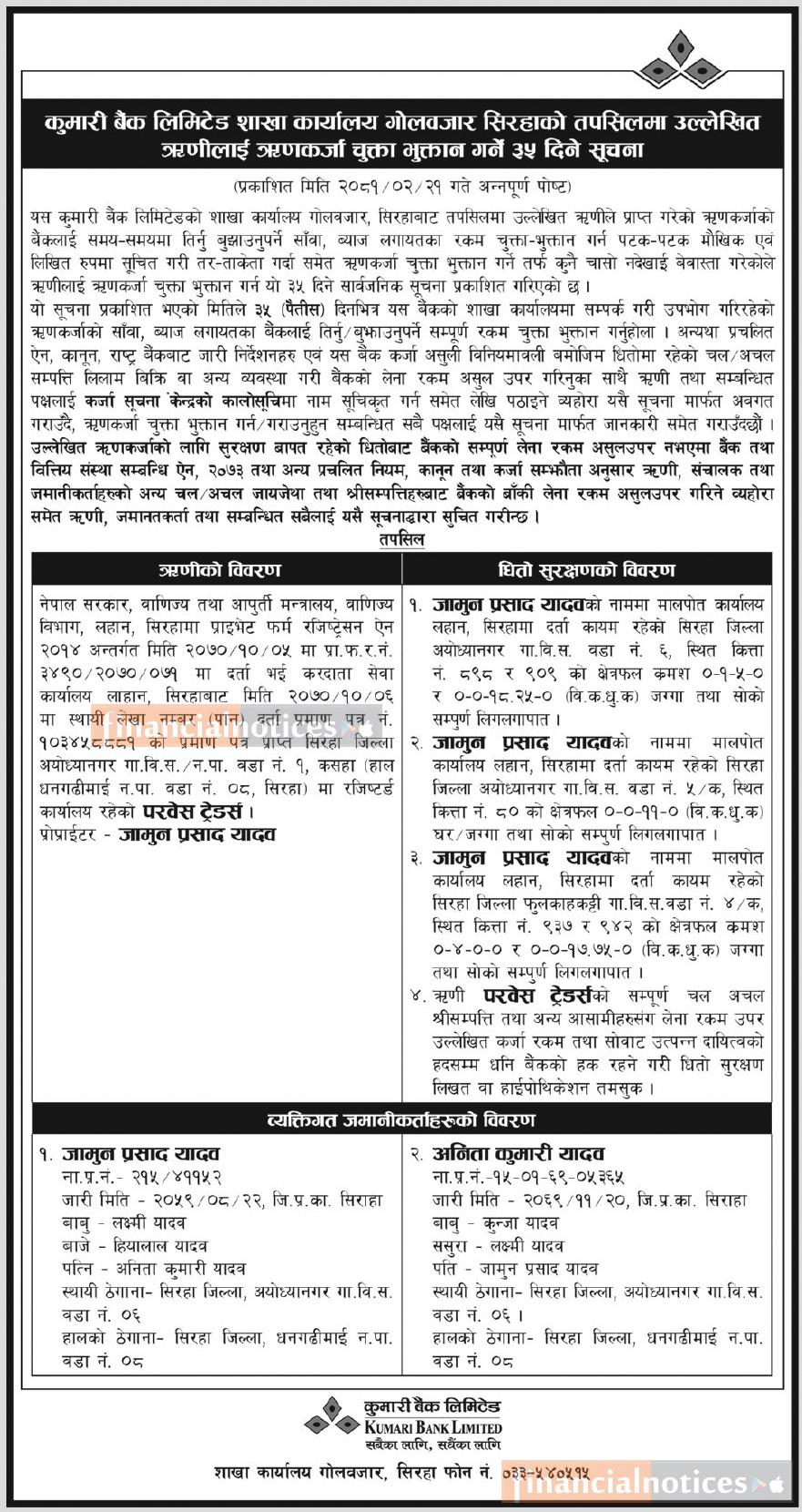 सिरहाको तपसिलमा उल्लेखित ऋणीहरुलाई ऋणकर्जा चुक्ता भुक्तान गर्ने ३५ दिने सूचना